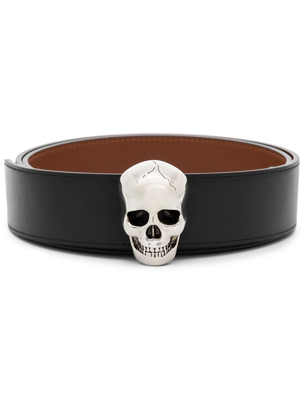 Totenköpfe sind zu einem ikonischen Emblem der Kollektionen von Alexander McQueen geworden und verleihen verzierten Accessoires wie diesem schwarz-braunen Wendegürtel aus Leder mit Totenkopfschnalle ein morbides Memento Mori.