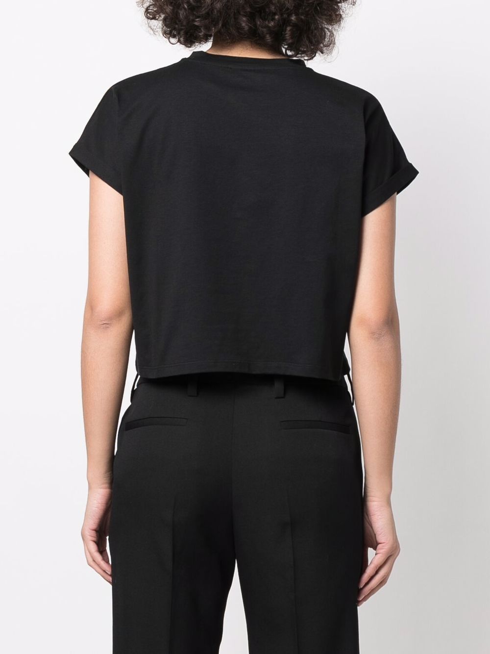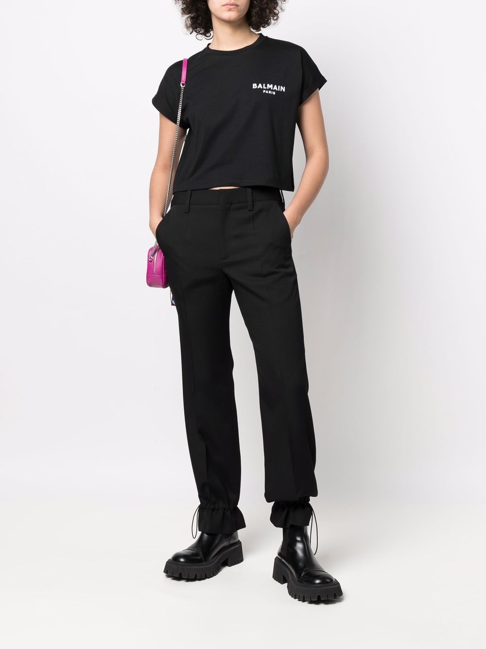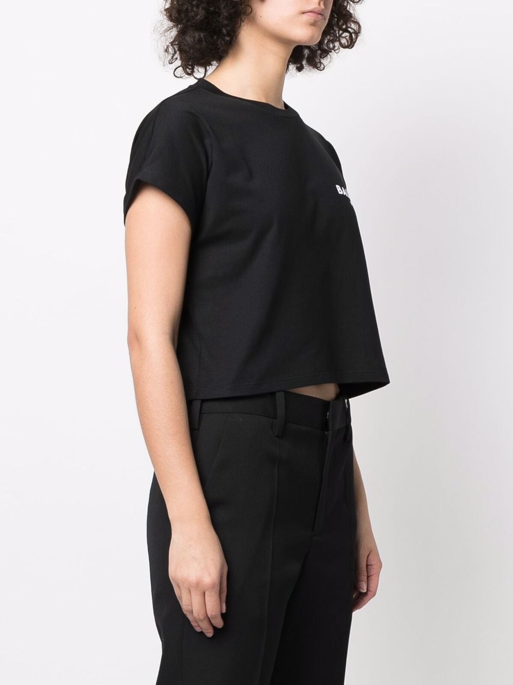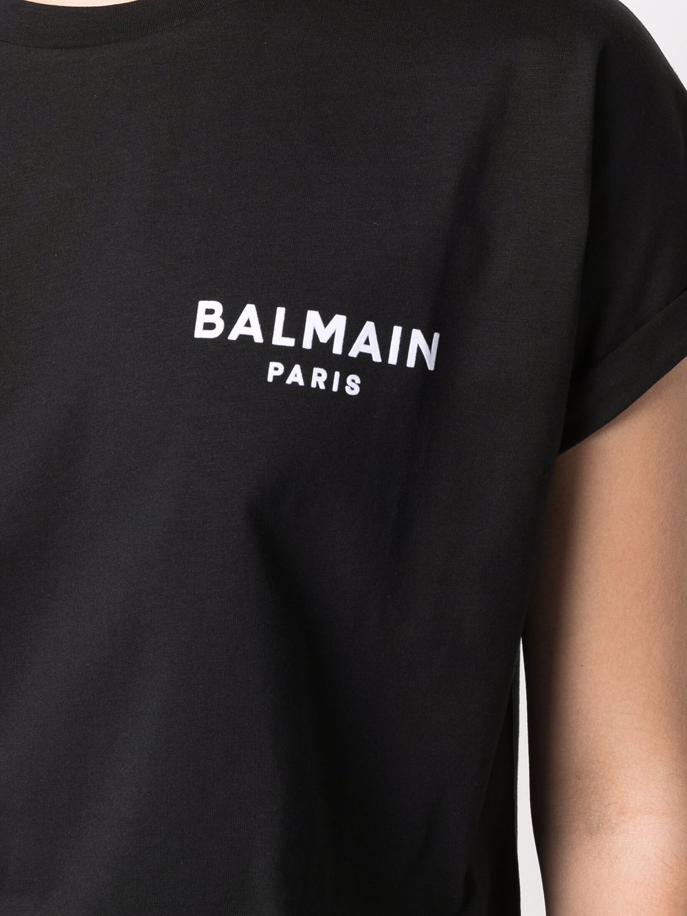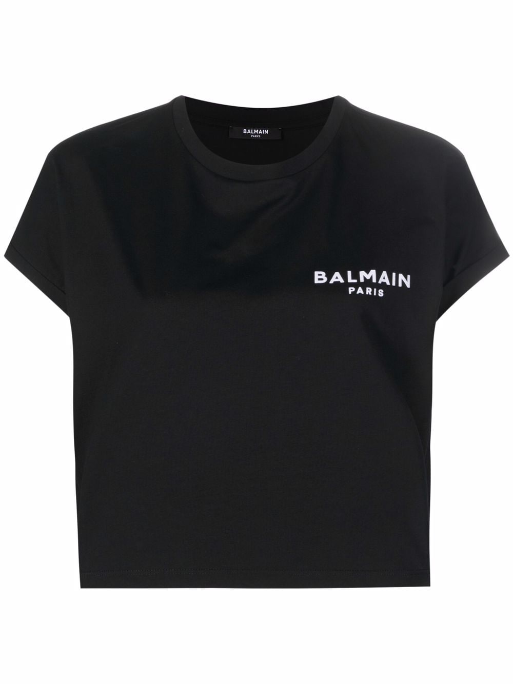 Dieses schwarze T-Shirt mit Rundhalsausschnitt von Balmain aus weicher Bio-Baumwolle und kurzem Schnitt ist auf der Brust mit einem Logo-Aufdruck in kontrastierendem Weiß versehen.
