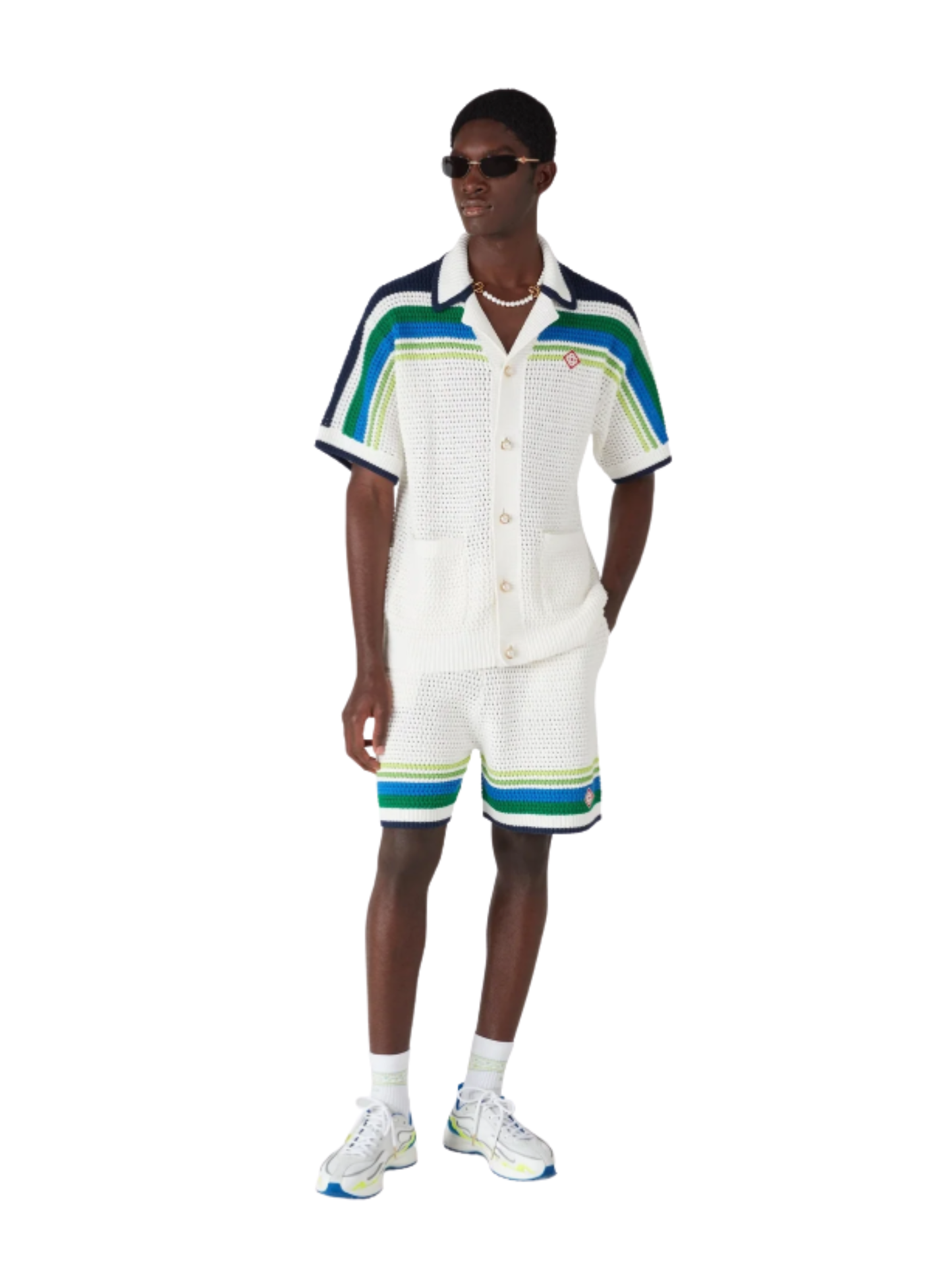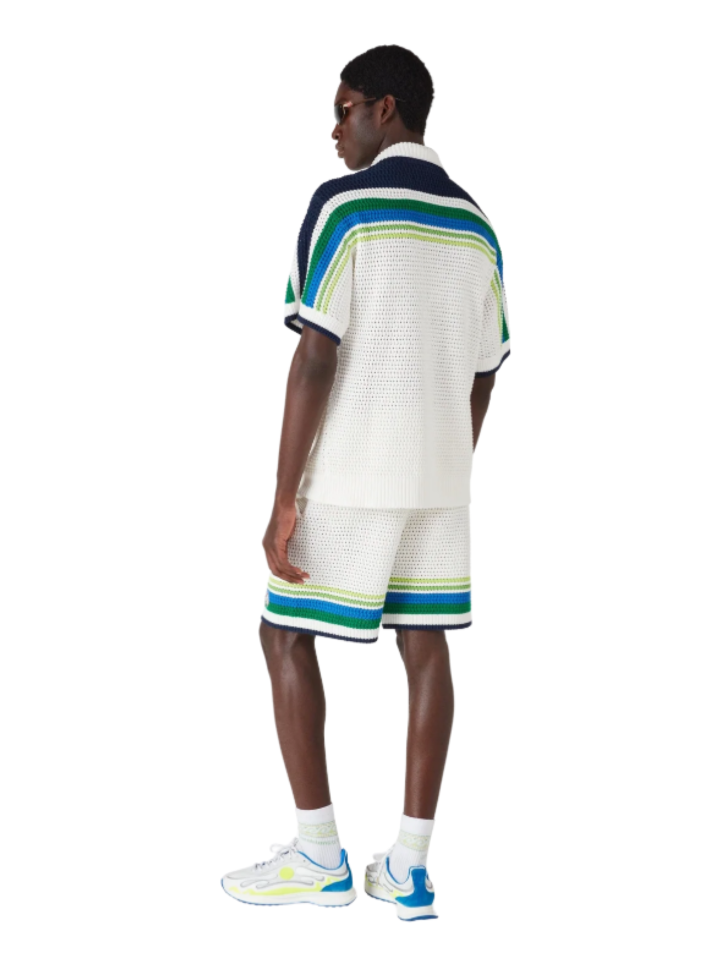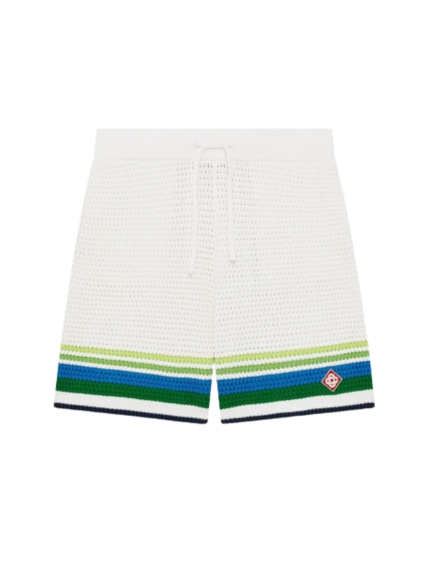 The stripe knit shorts are a refined soft textured design crafted from a crochet cotton fabric, featuring the signature tennis stripe design in natural colours. Finished with a ribbed elasticised waistband with drawstring fastening, side pockets and a relaxed silhouette.