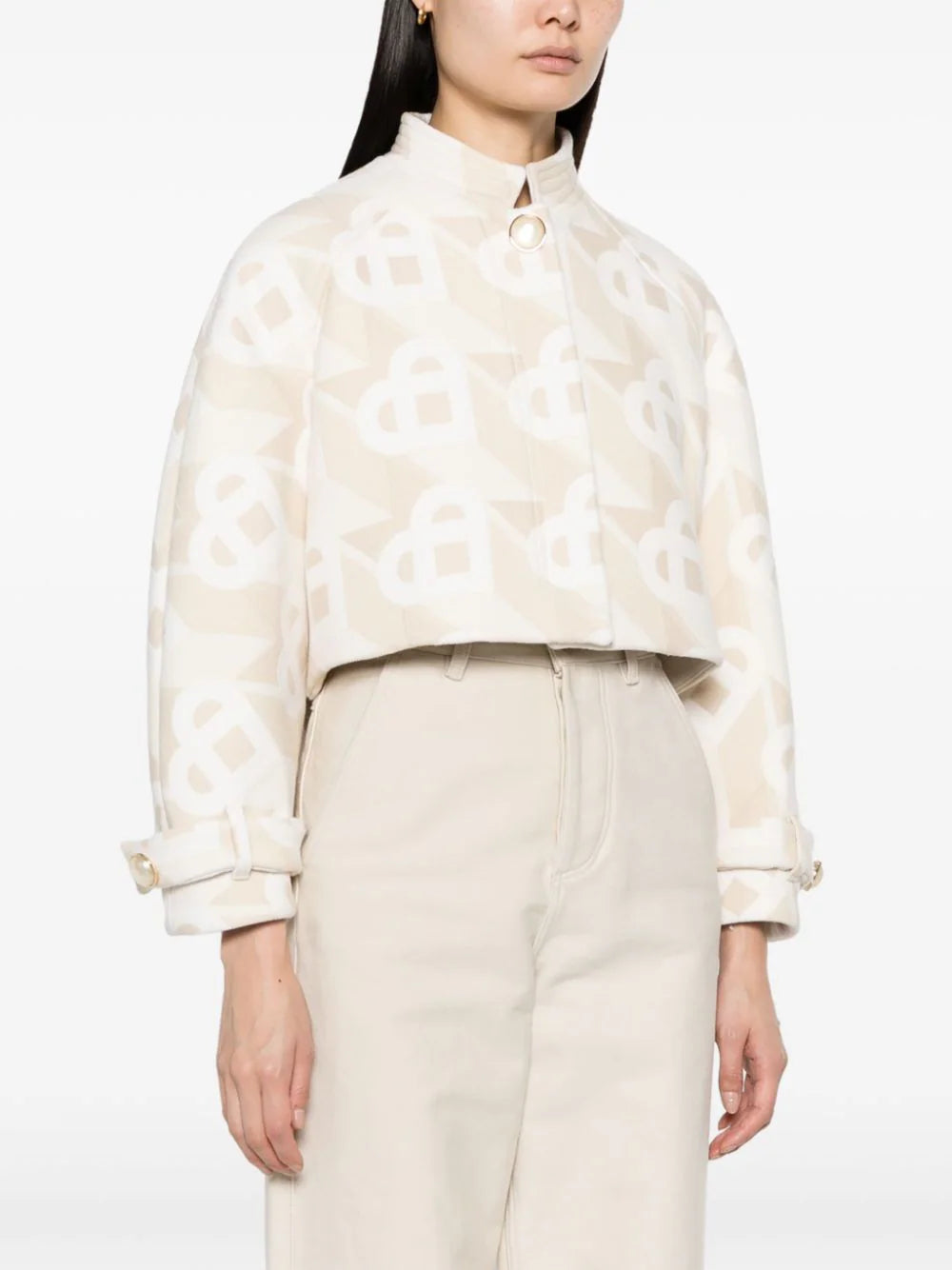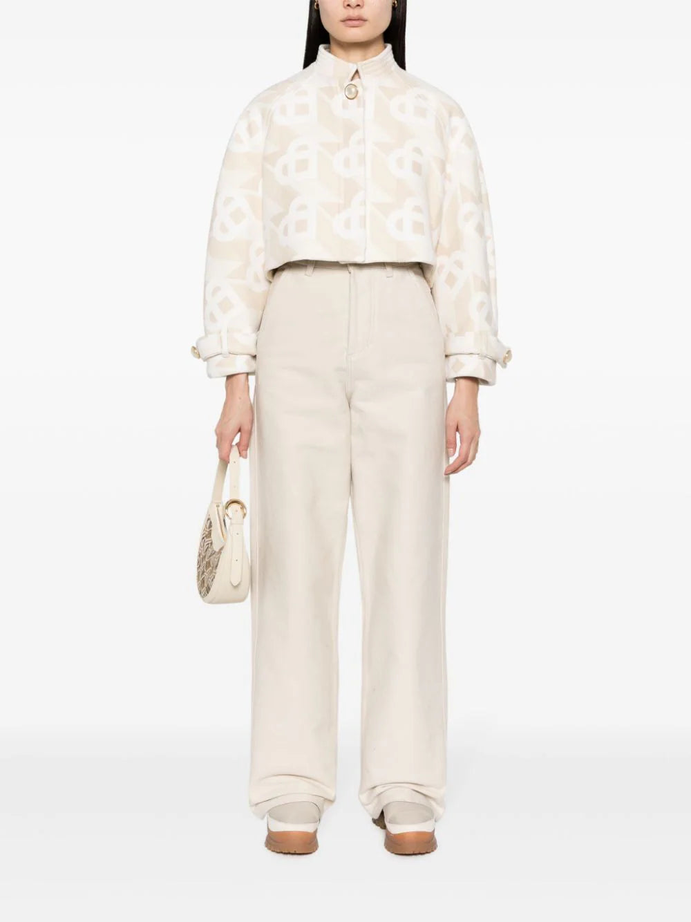 Diese in Portugal gefertigte, verkürzte Jacke von Casablanca besticht durch ein weißes Monogramm-Logomuster, das einen Kontrast zum cremefarbenen Hintergrund bildet. Sie verfügt über einen gerippten, halbhohen Kragen und einen asymmetrischen Saum.