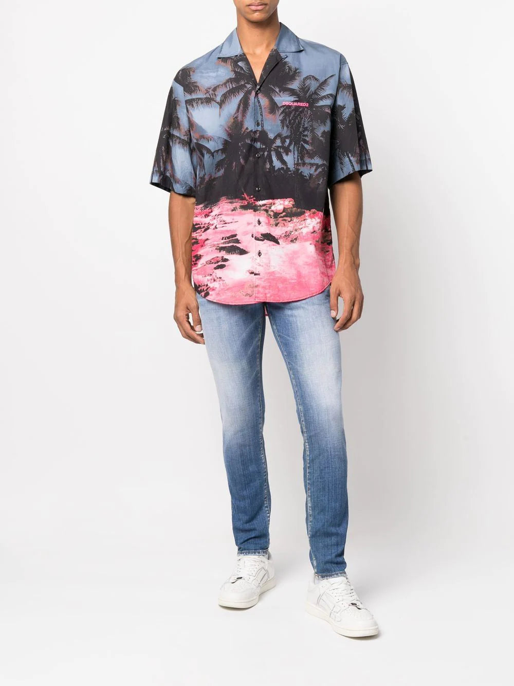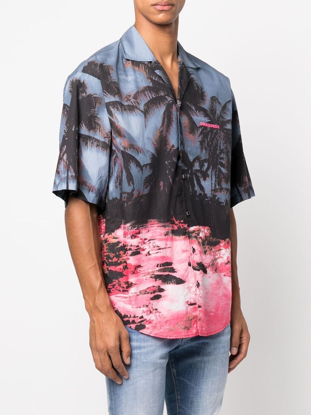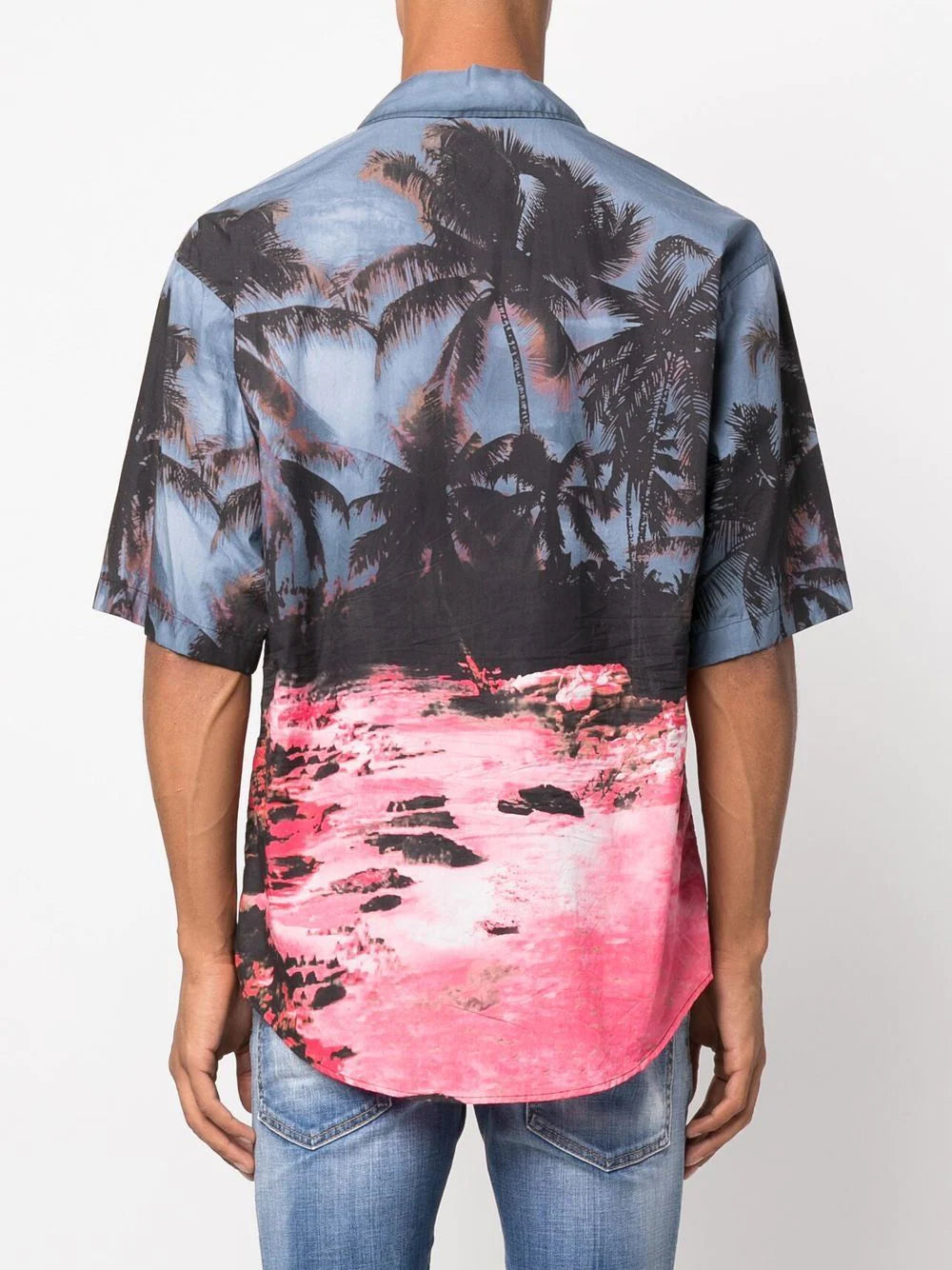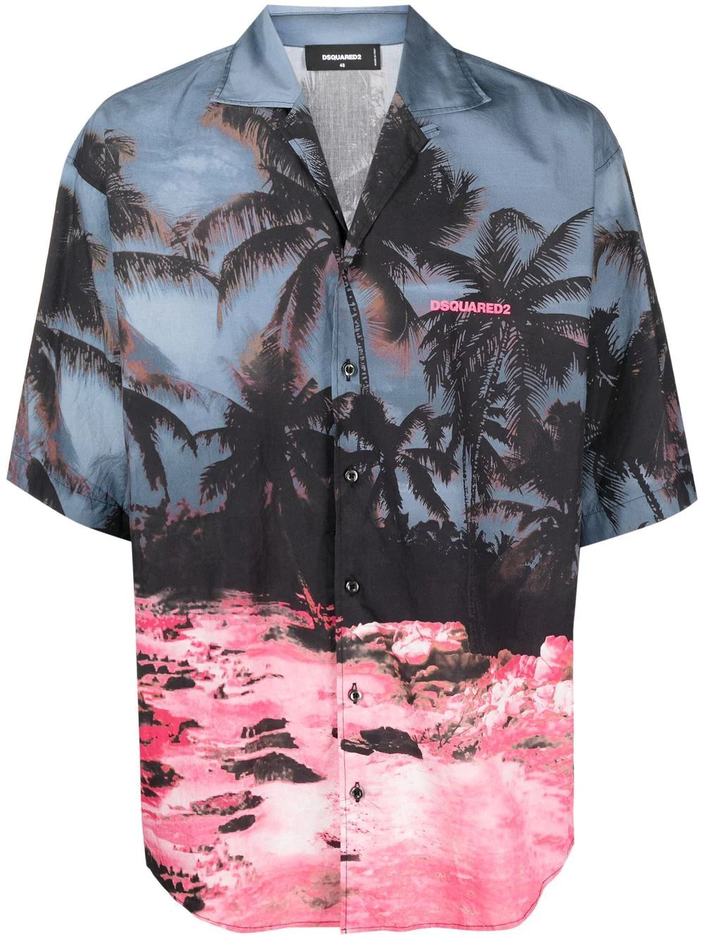Kurzärmliges Hemd mit Palmen-Print von DSQUARED2 mit mehrfarbigem Palmen-Print, klassischem Kragen, Knopfverschluss vorne, kurzen Ärmeln, abgerundetem Saum und Baumwolle.