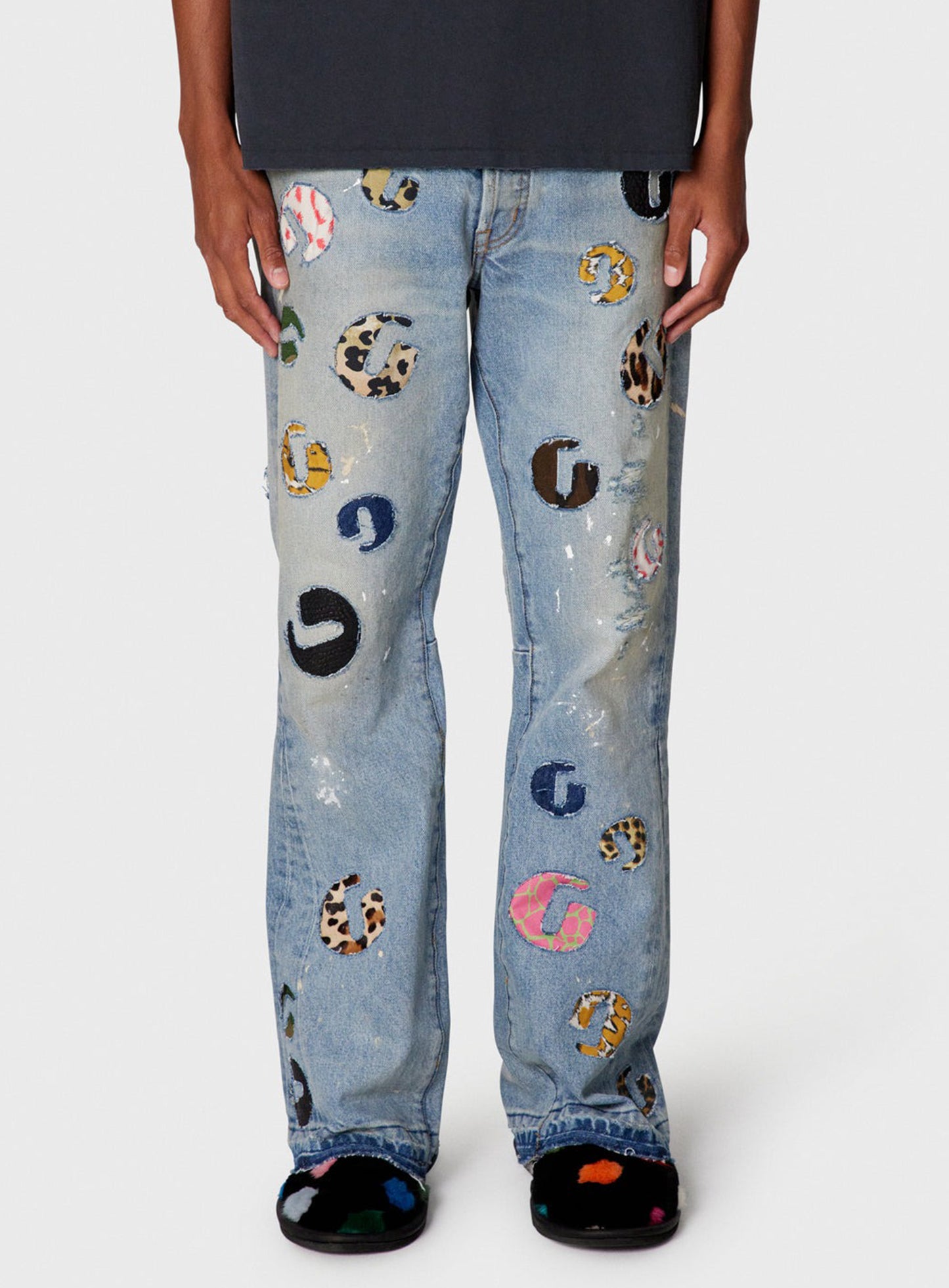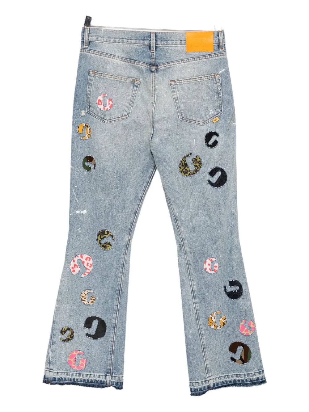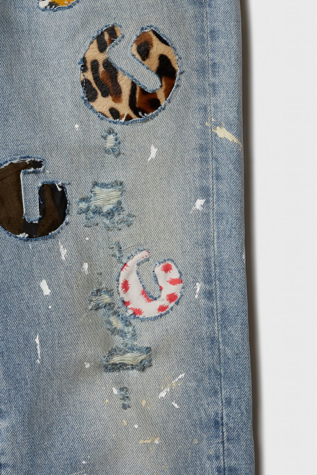 - Mittlere Leibhöhe, ausgestelltes Bein, Gürtelschlaufen, fünf Taschen, Risse mit Patchwork-Einsätzen, Farbspritzer-Effekt, Logo-Stickerei auf der aufgesetzten Vordertasche, Designer-Plakette auf der Rückseite, Designer-Hardware, Used-Look und verwaschenes Finish