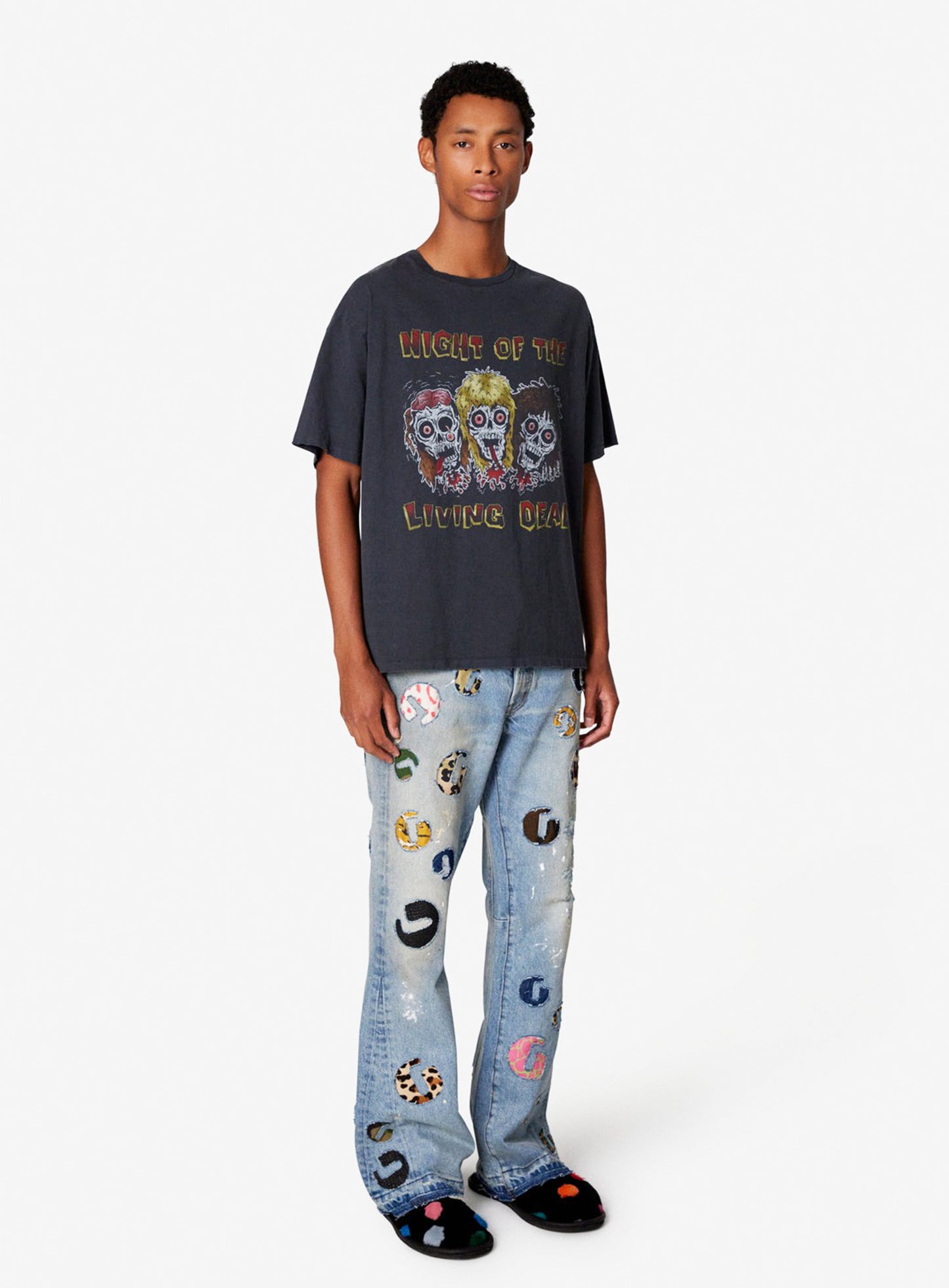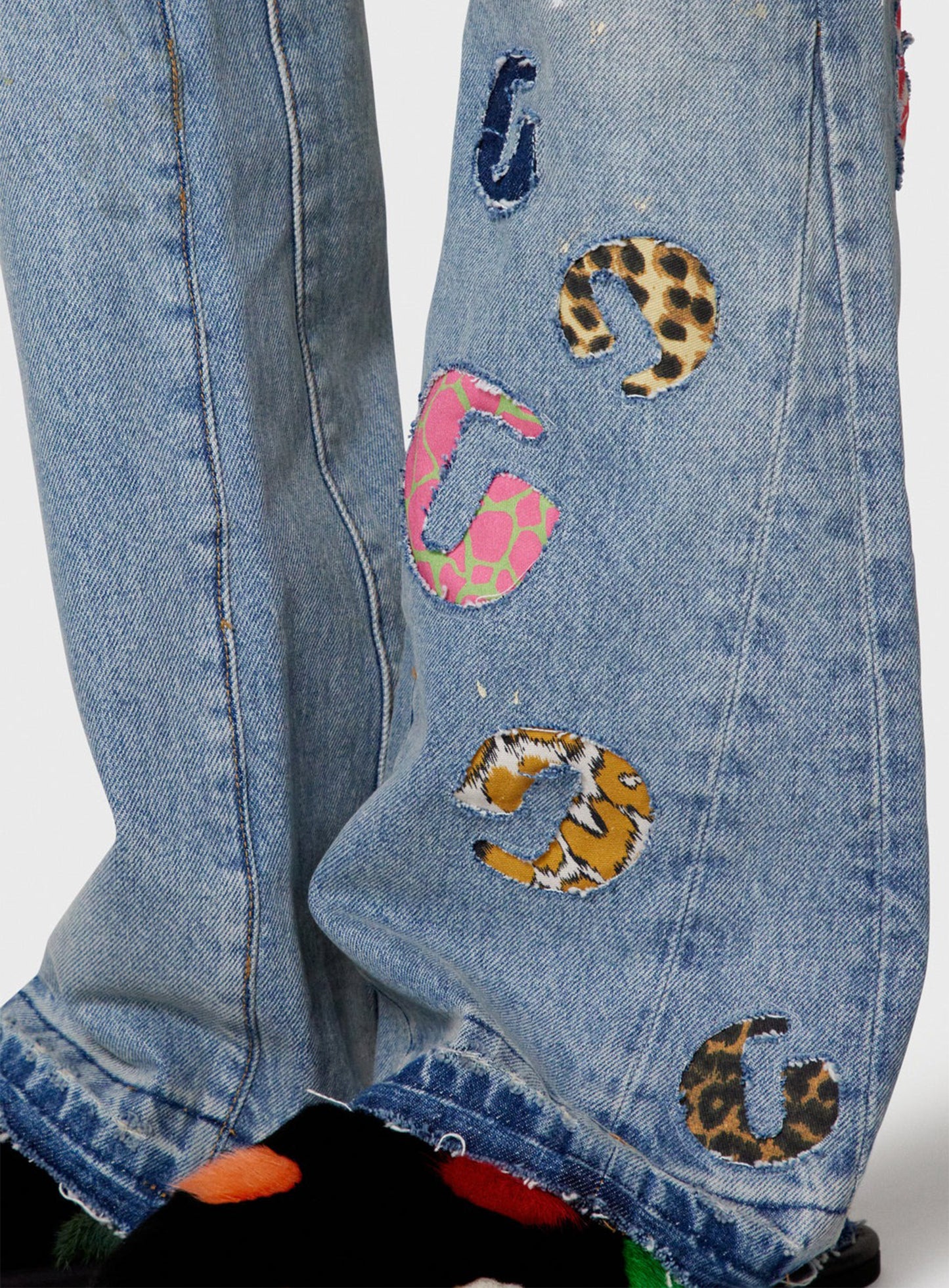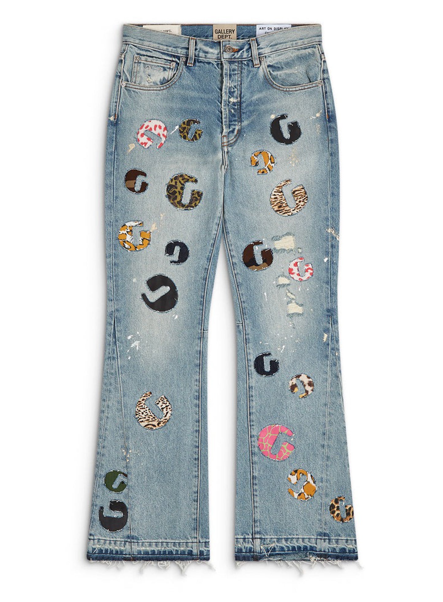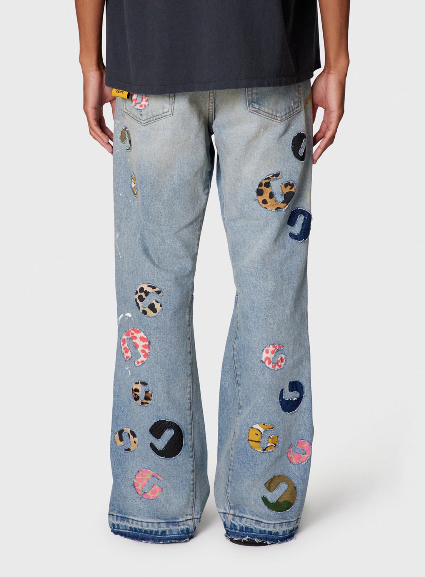 - Mittlere Leibhöhe, ausgestelltes Bein, Gürtelschlaufen, fünf Taschen, Risse mit Patchwork-Einsätzen, Farbspritzer-Effekt, Logo-Stickerei auf der aufgesetzten Vordertasche, Designer-Plakette auf der Rückseite, Designer-Hardware, Used-Look und verwaschenes Finish