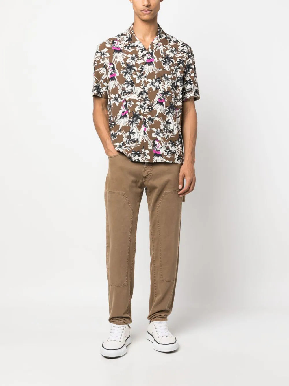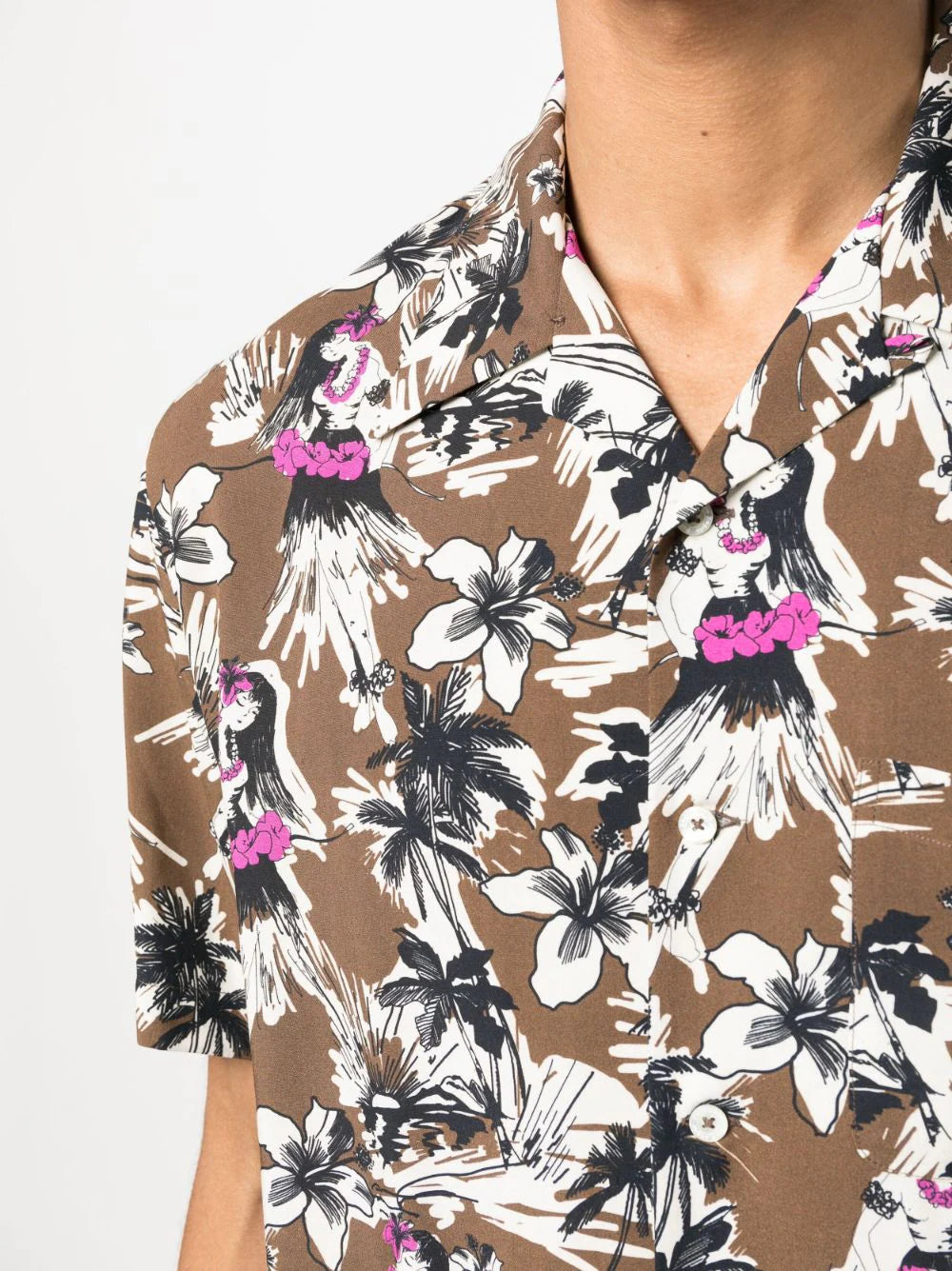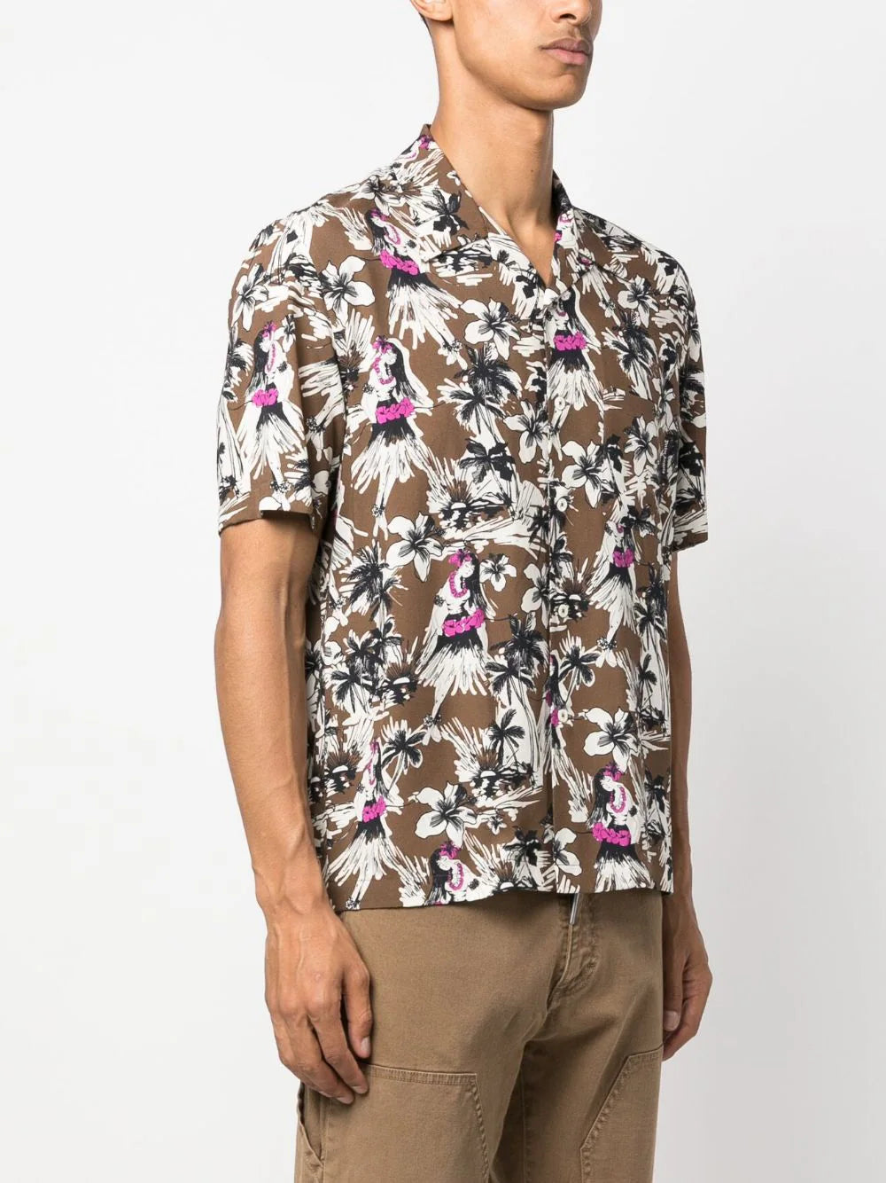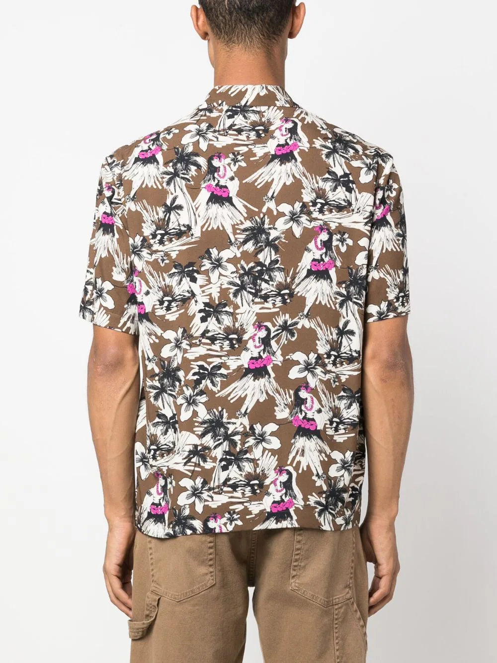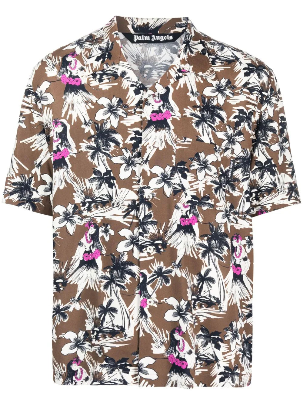 Als Anspielung auf seine entspannte Ästhetik verziert Palm Angels dieses Kurzarmhemd mit einem Grafikdruckstil. Neben einer traditionellen Tänzerin und Blumenmotiven sind überall charakteristische Palmen zu sehen.
