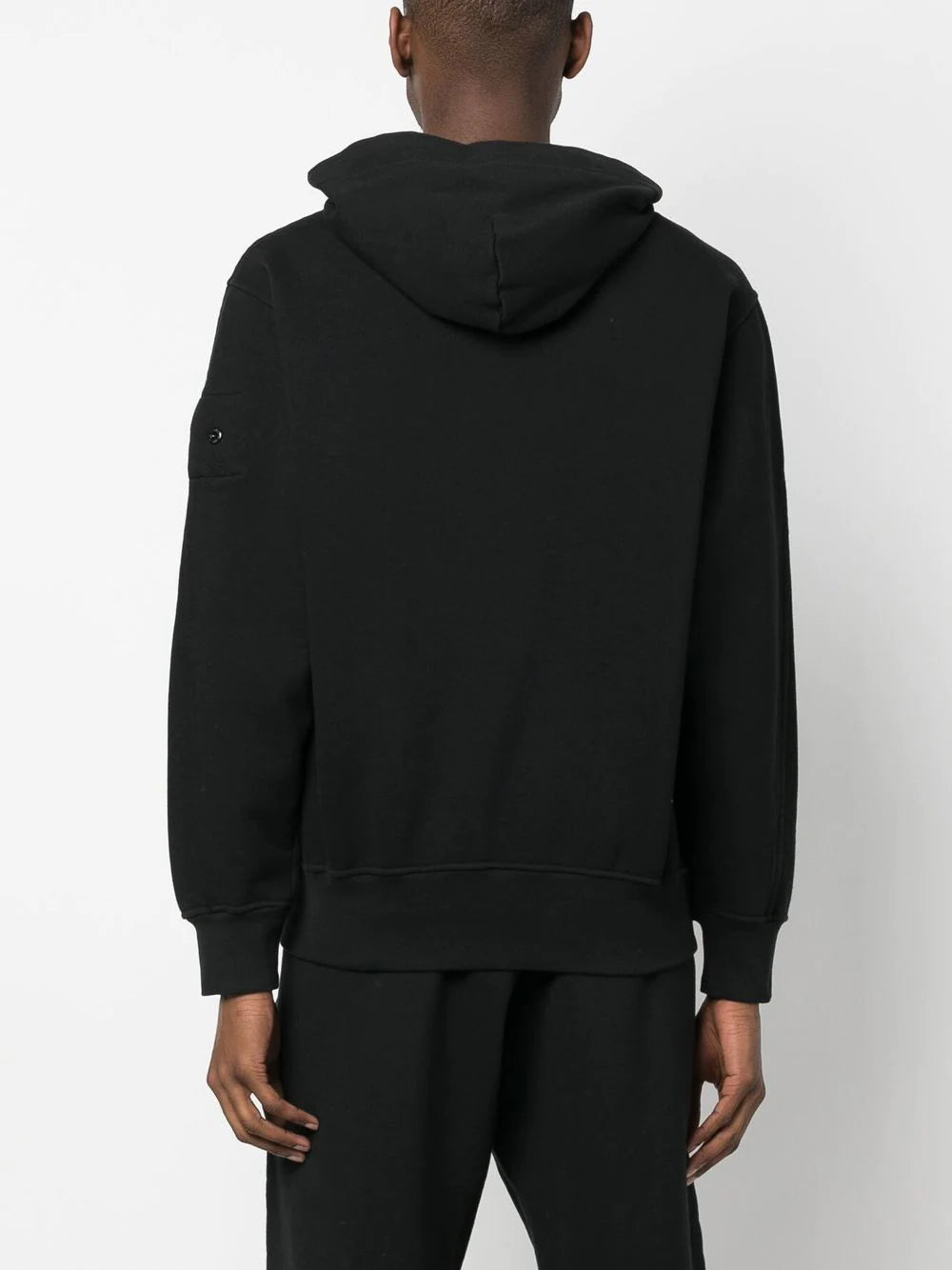 Kapuzenjacke mit Riemen von STONE ISLAND SHADOW PROJECT in Schwarz, Baumwollmischung, Logo-Patch am Ärmel, dekorative Knopfdetails, klassische Kapuze, zwei Pattentaschen vorne, Reißverschluss vorne, lange Ärmel, verstellbarer Schulterriemen und gerader Saum.