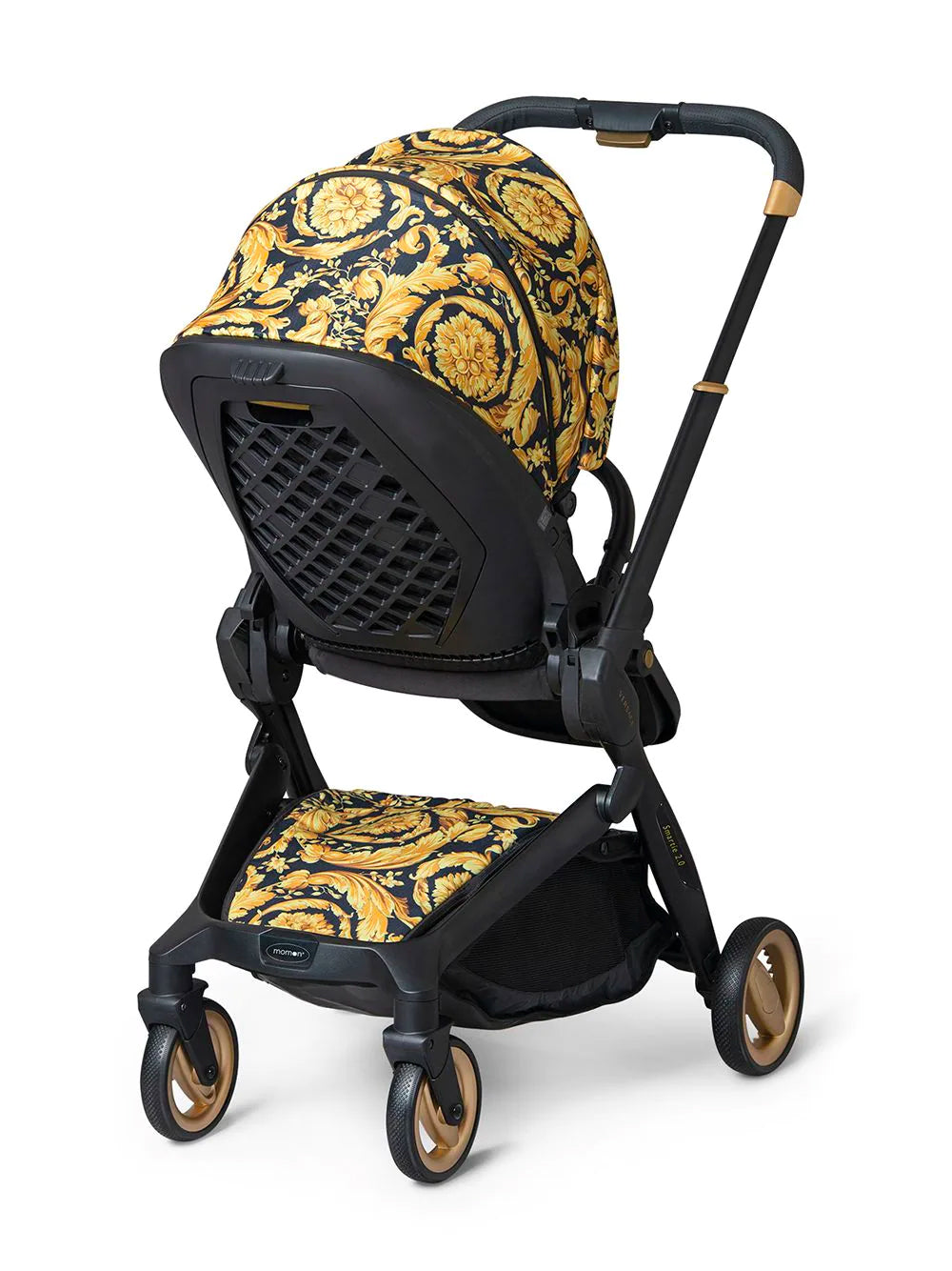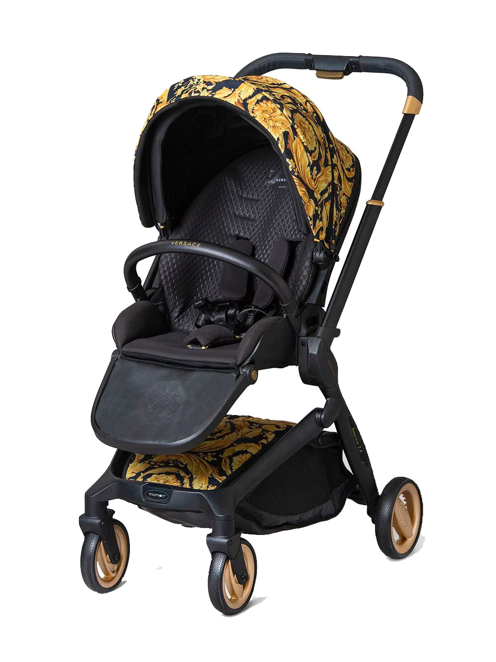 This stroller from Versace Kids is adorned with the house's Barocco print in gold-tone and black. Suitable from birth to 22kg, it has a reversible seat with a breathable back and a canopy with an expandable window for ventilation.