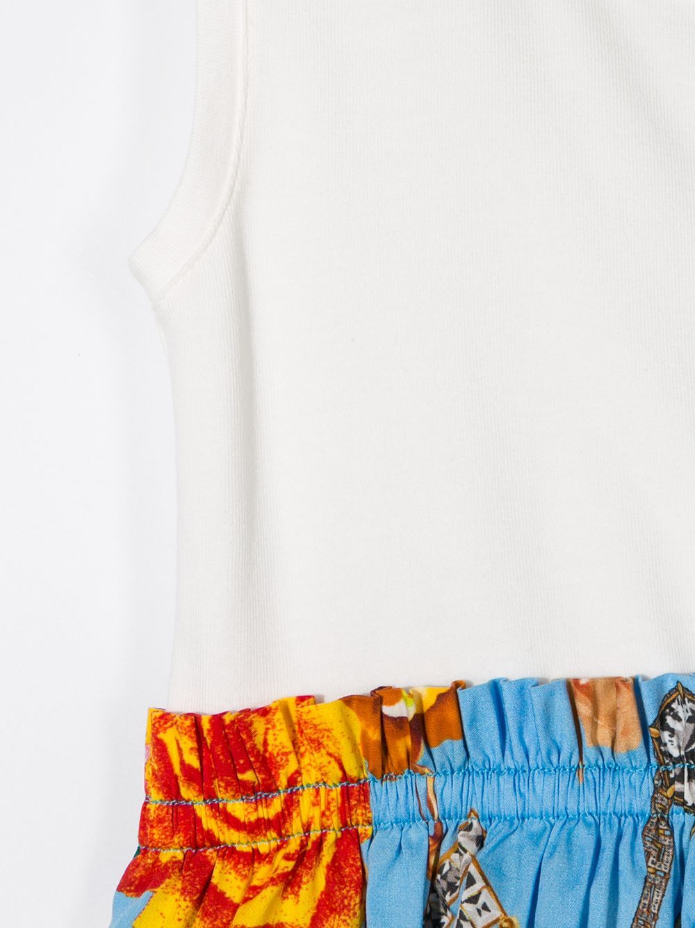 White and blue cotton blend contrast-panel midi dress from YOUNG VERSACE featuring printed fabric details, contrasting panels, a sleeveless design and a round neck.