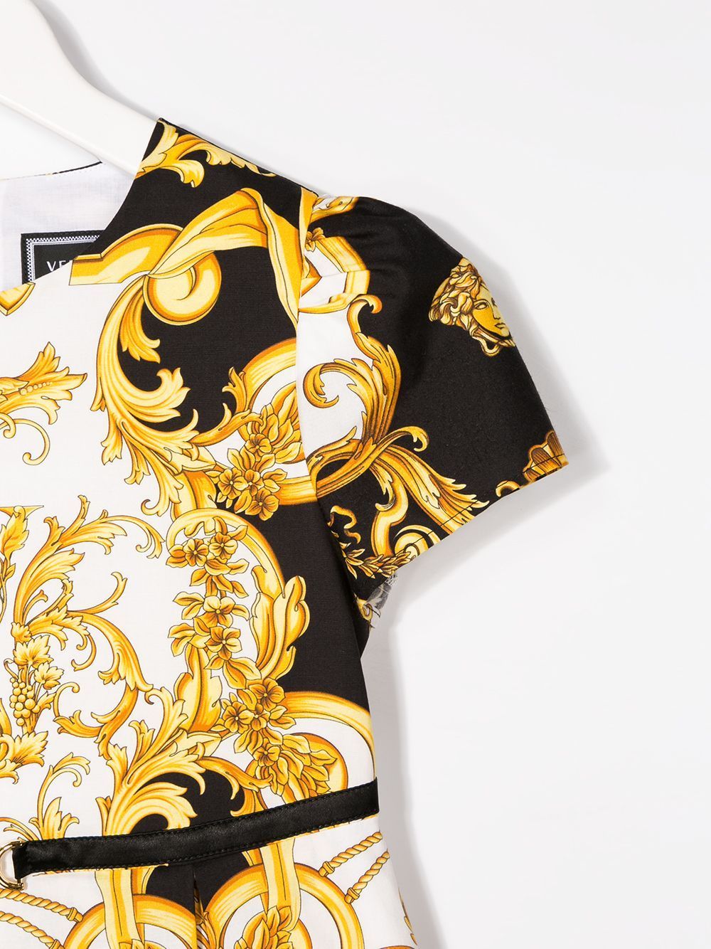 Black, white and gold silk and cotton-blend baroque-print box pleated dress from YOUNG VERSACE featuring a baroque print, a box pleat design, a round neck, short sleeves, a fitted waist, a gold-tone logo plaque and an invisible back zip fastening.