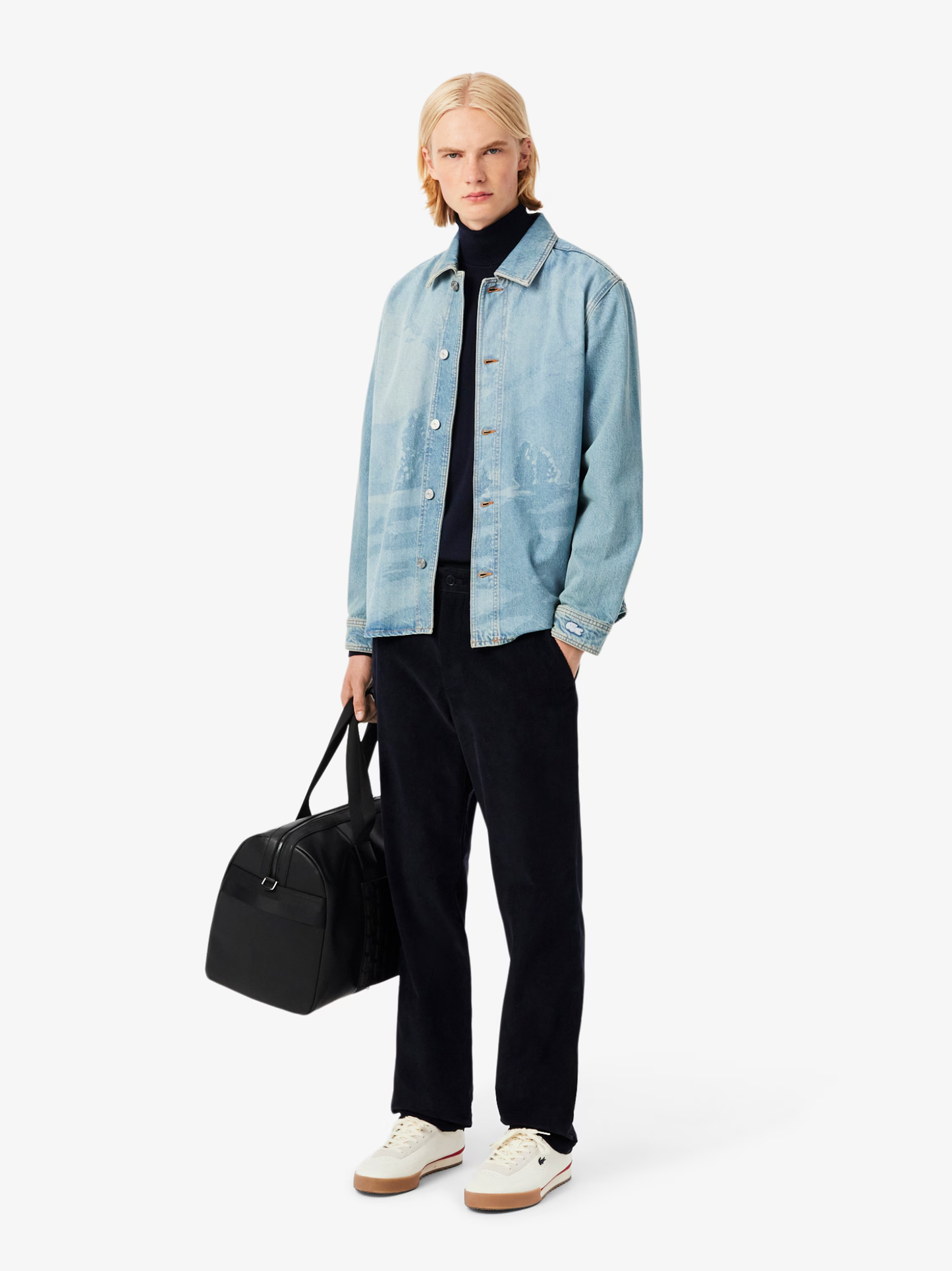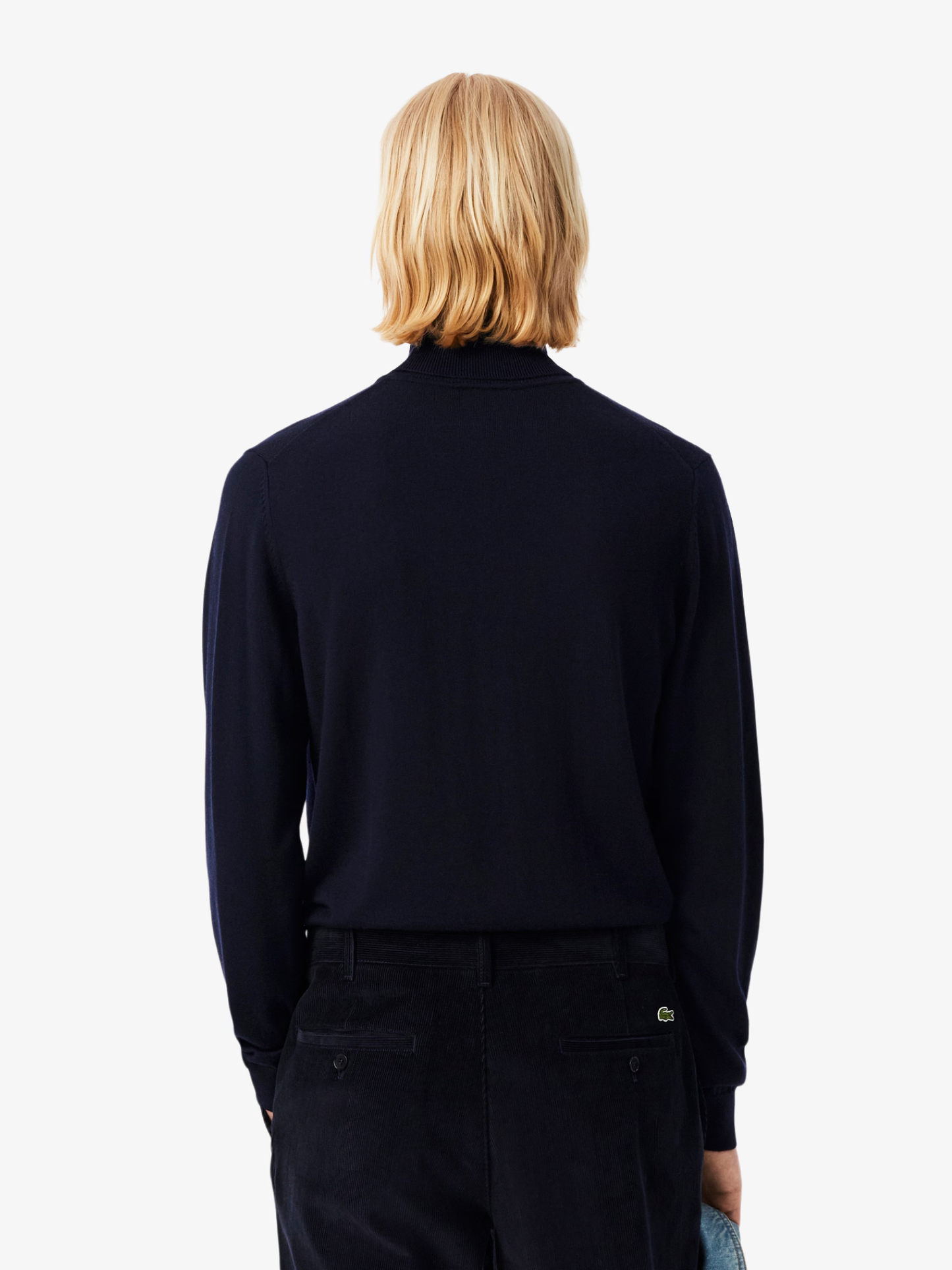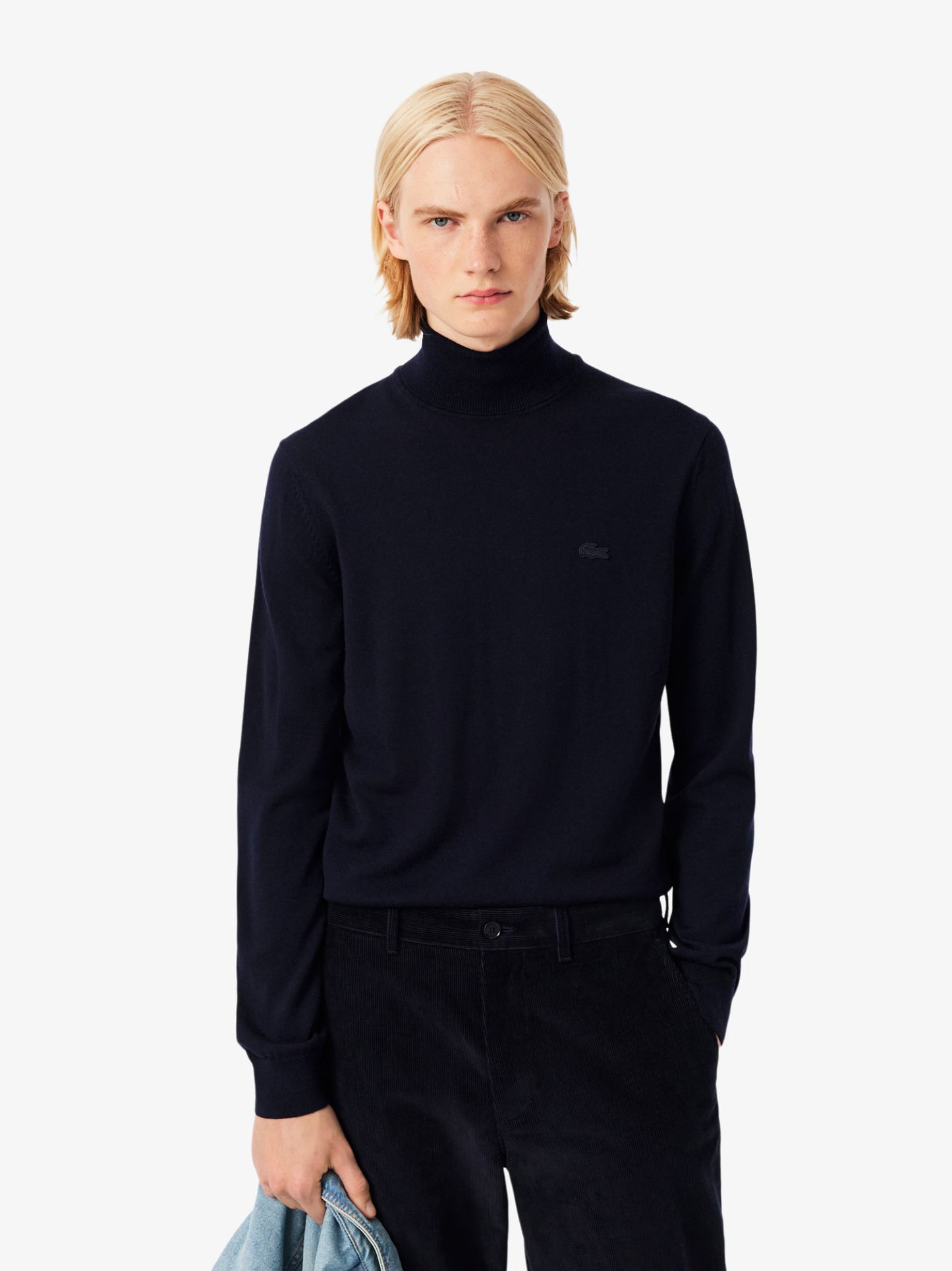 Streamlined flair defines this classic masculine icon featuring an ultra-chic turtleneck. Ethical farming made this merino wool jersey sweater possible and eco-friendly, it is enhanced by ribbed finishes and an embroidered crocodile on the chest. This masculine essential will keep you snug when the chill sets in.