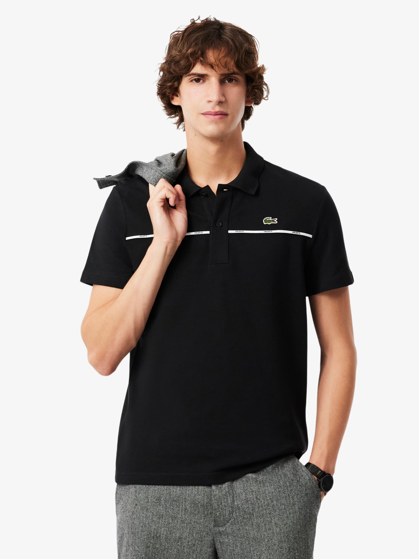 - Central contrast trim detail with Lacoste branding.