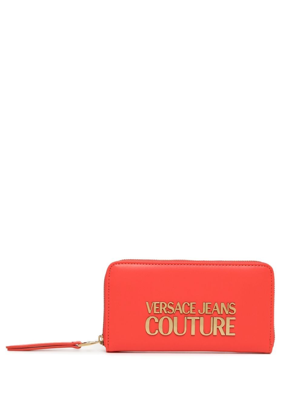 logo-lettering zip-around wallet from VERSACE JEANS COUTURE featuring bright red, faux leather, gold-tone logo lettering, all-around zip fastening, partitioned compartment, internal zip-fastening pocket and internal card slots.