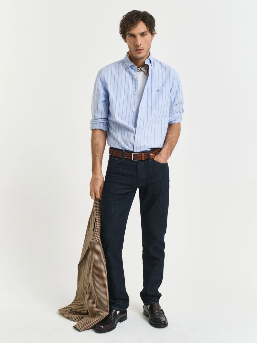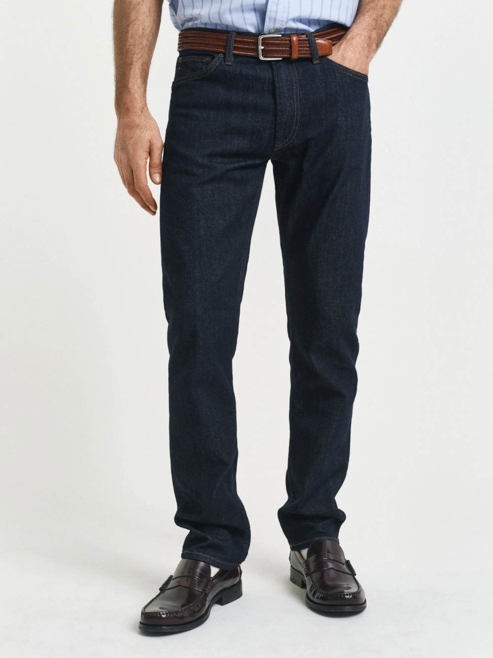 Crafted in cotton with a hint of stretch, these jeans feature a regular fit for a comfortable, classic style. A versatile wardrobe staple, these jeans are easily dressed up or down for almost any occasion.