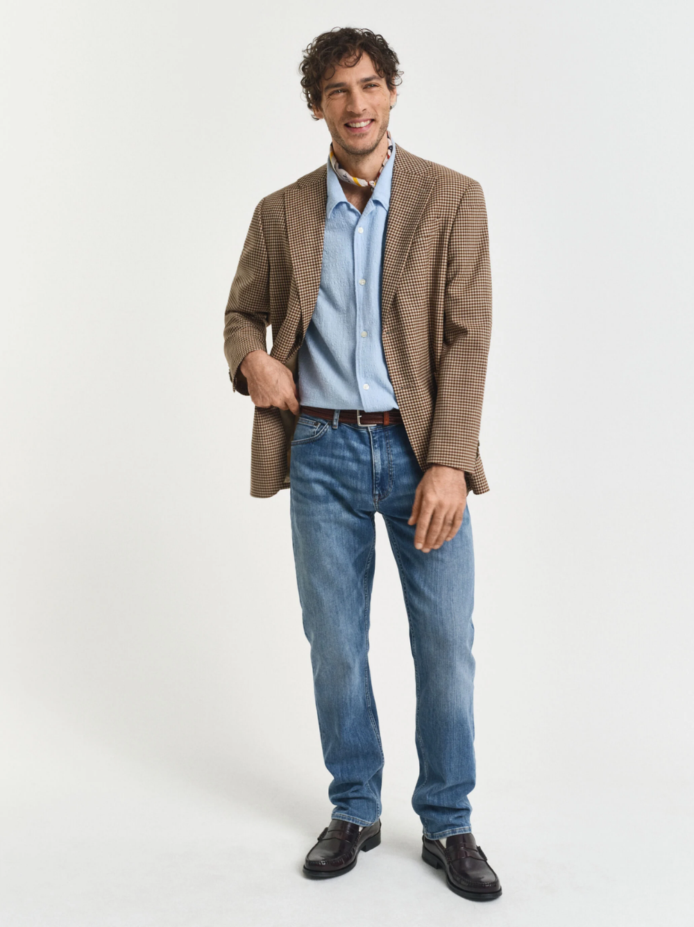 Crafted in cotton with a hint of stretch, these jeans feature a regular fit for a comfortable, classic style. A versatile wardrobe staple, these jeans are easily dressed up or down for almost any occasion.