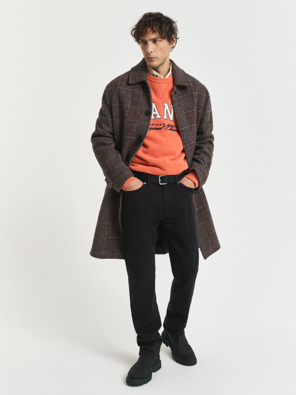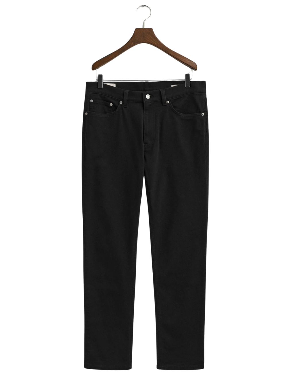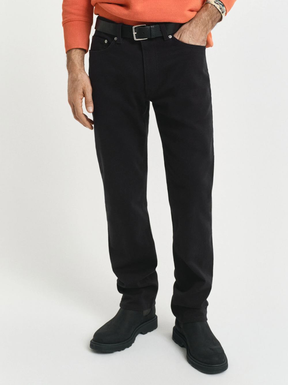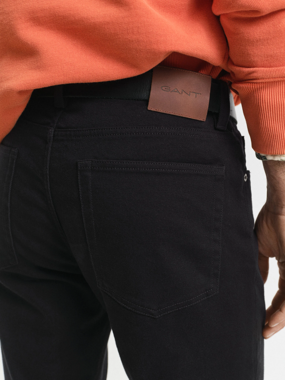 Following a classic and timeless style, this jean is cut with a mid-rise waist and a regular fit that's slim over the hip and straight at the knee and leg. Crafted from a soft brushed twill fabric with comfort stretch, these jeans have a 5-pocket design, branded shank buttons and rivets, a zip fly and a leather GANT logo patch at the back.