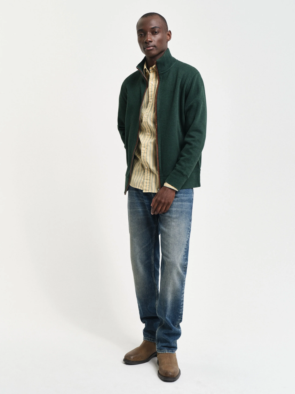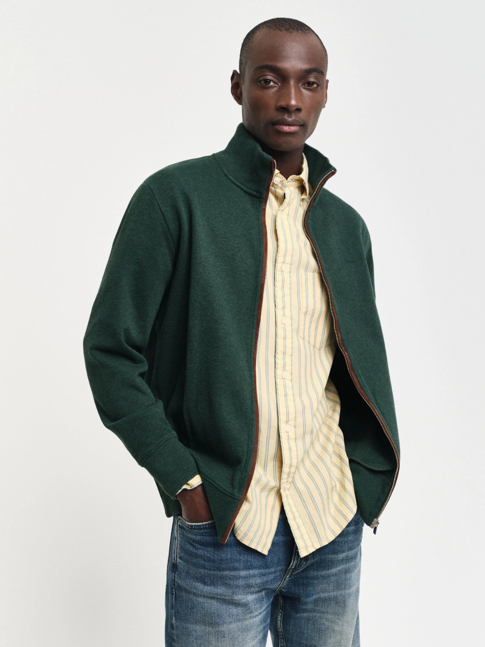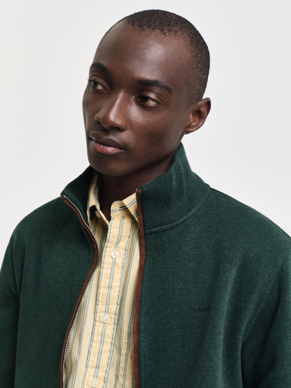 Crafted from 100% cotton with a soft hand-feel, this zip cardigan is cut for a regular fit and features a silver-toned metal zipper and imitation suede details on the placket and neck tape. The design is complete with a tonal GANT embroidered at the chest.
