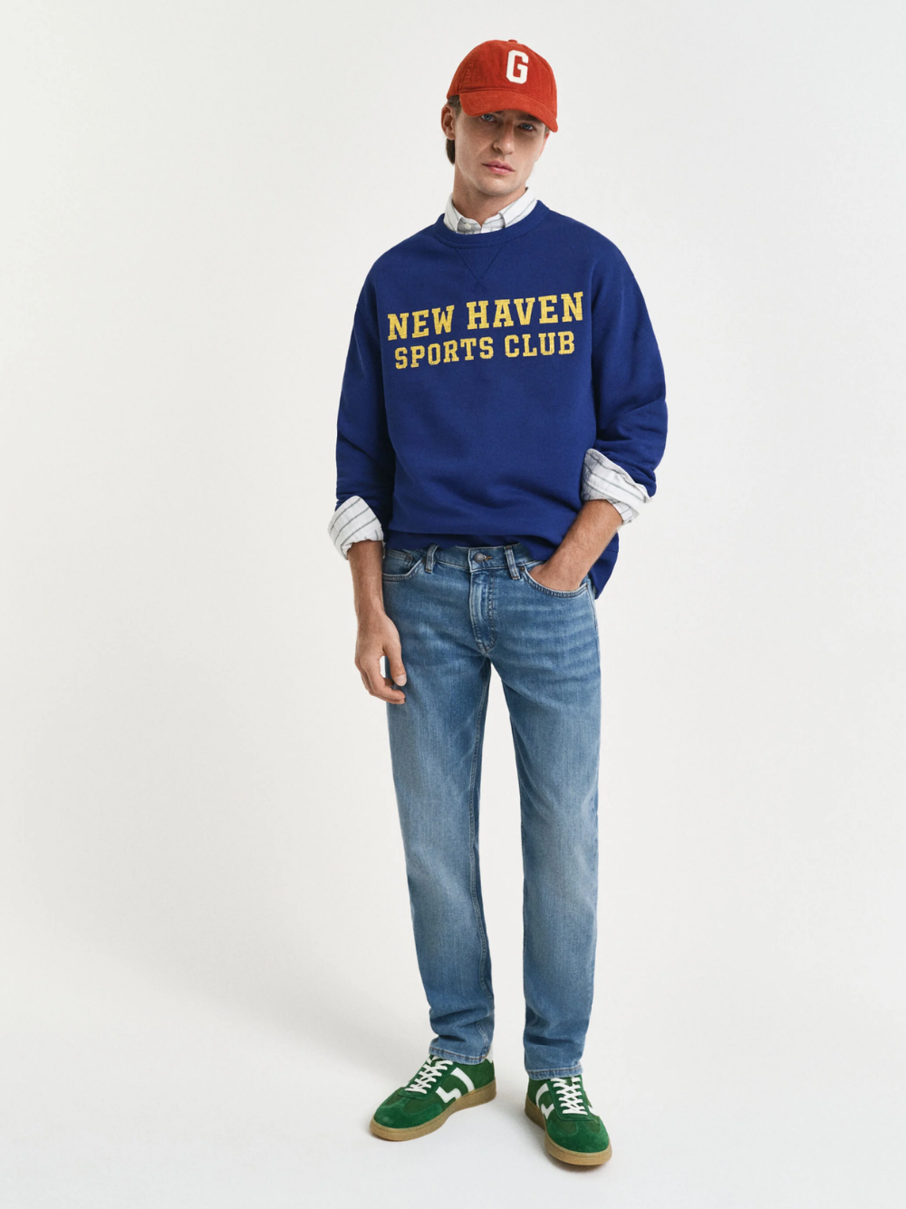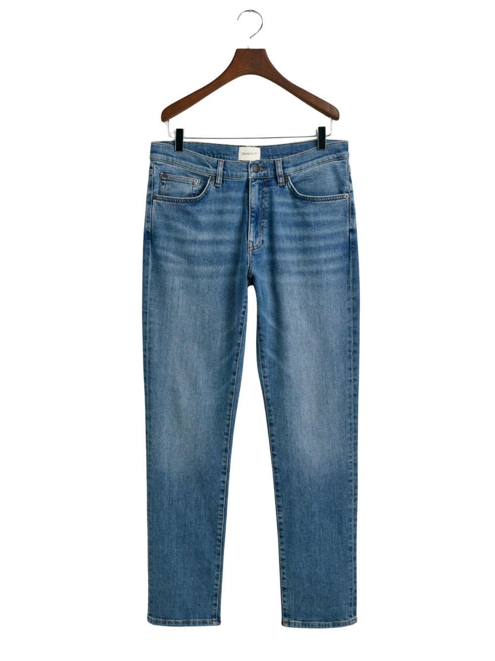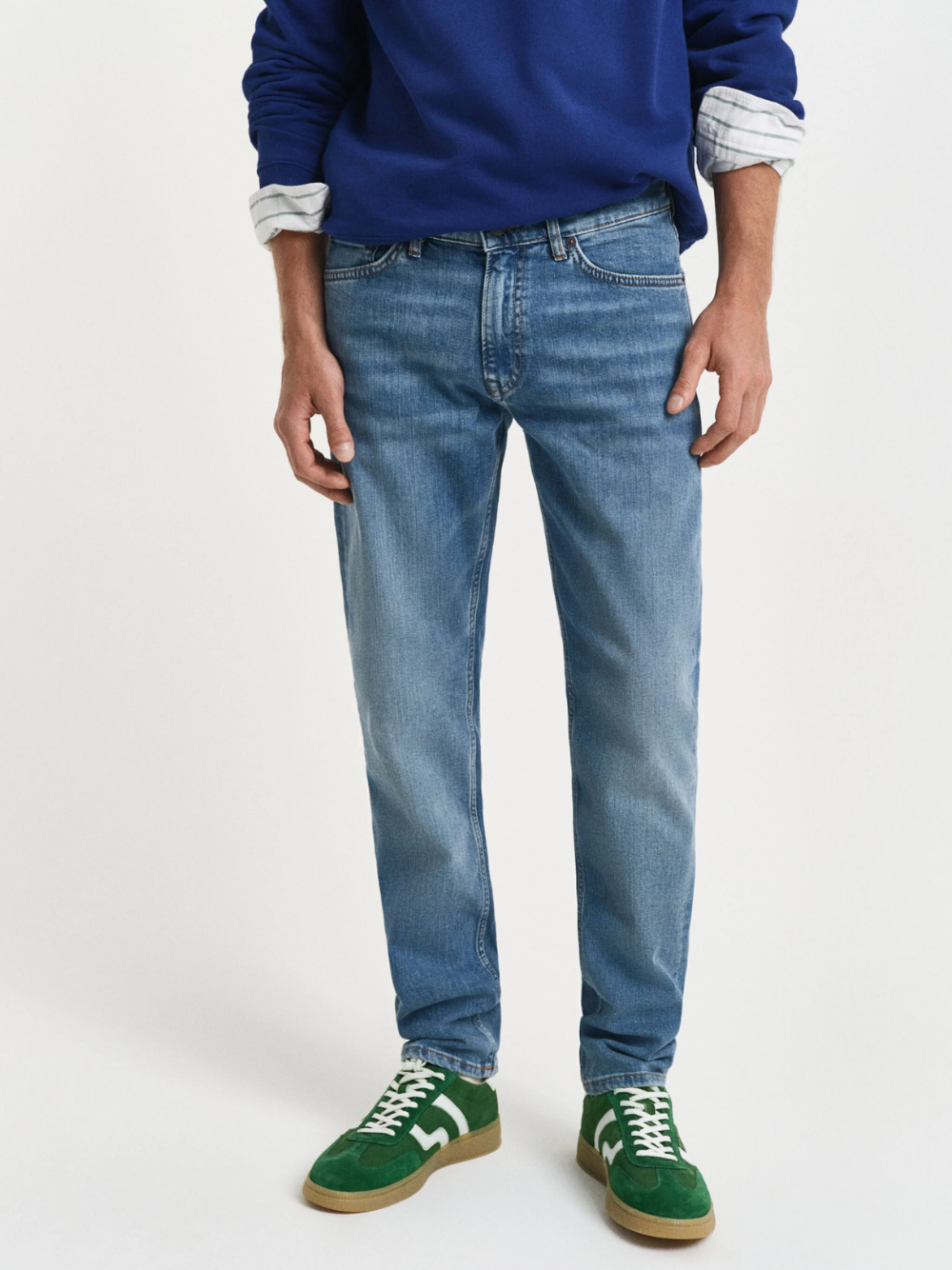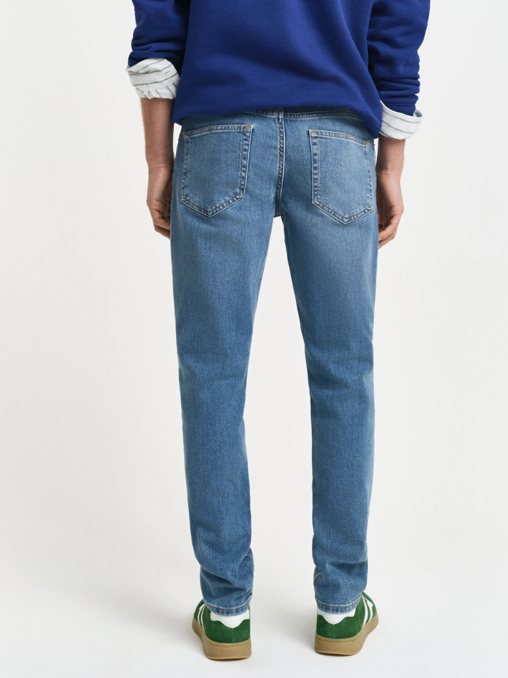 Crafted in a cotton blend with a hint of stretch, these mid-rise jeans are cut in a slim fit for a contemporary style. Pre-washed for a worn-in feel, they feature branded shank button and rivets, a zip fly and a leather logo patch at the back waistband.