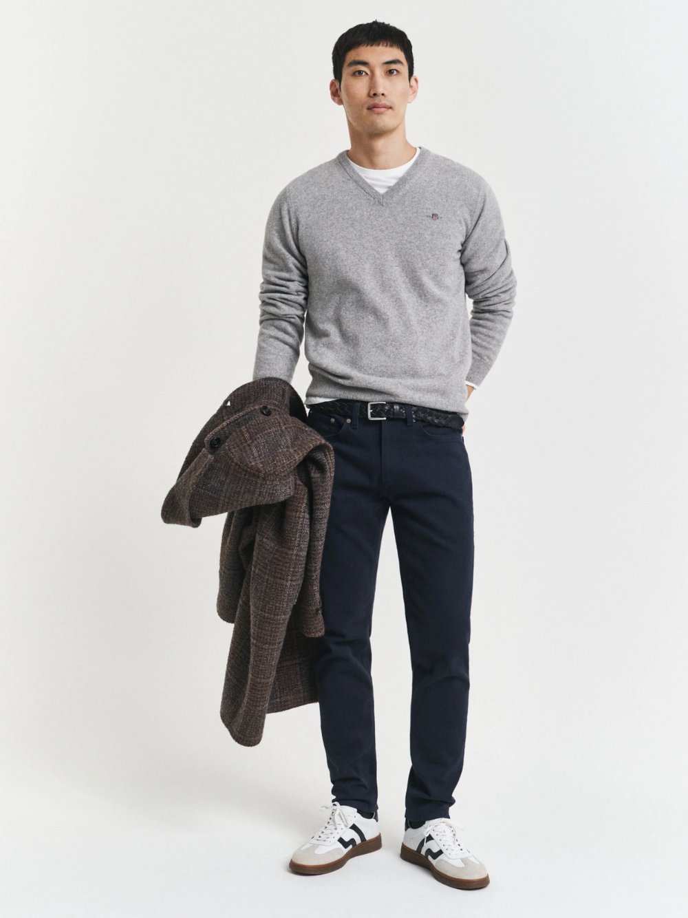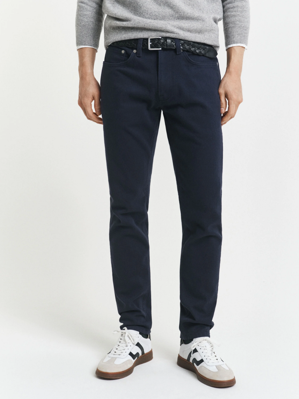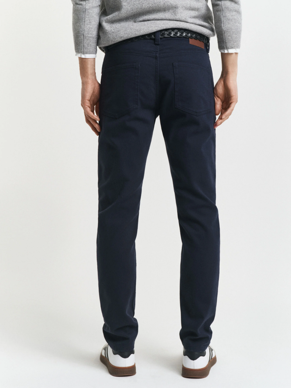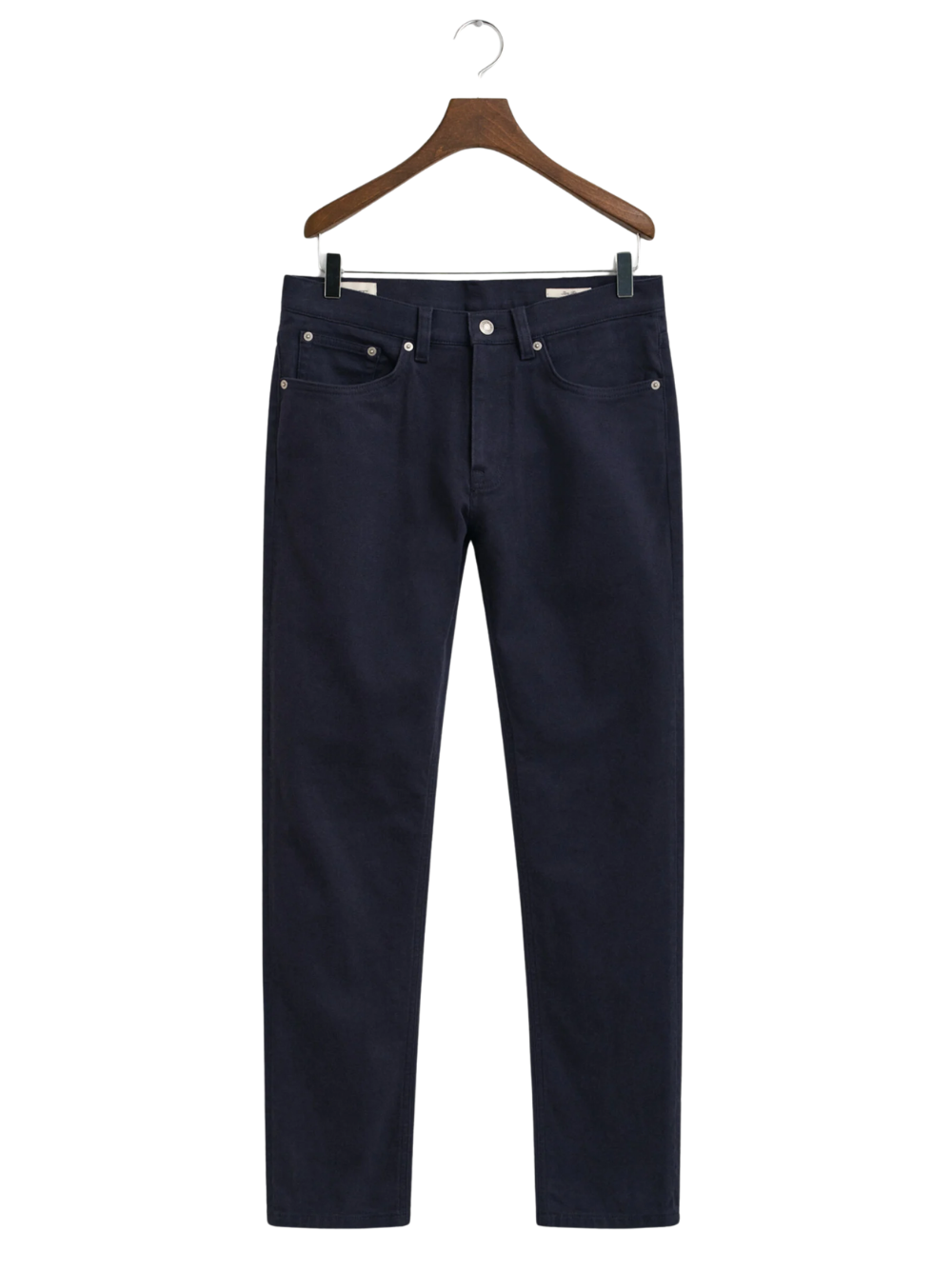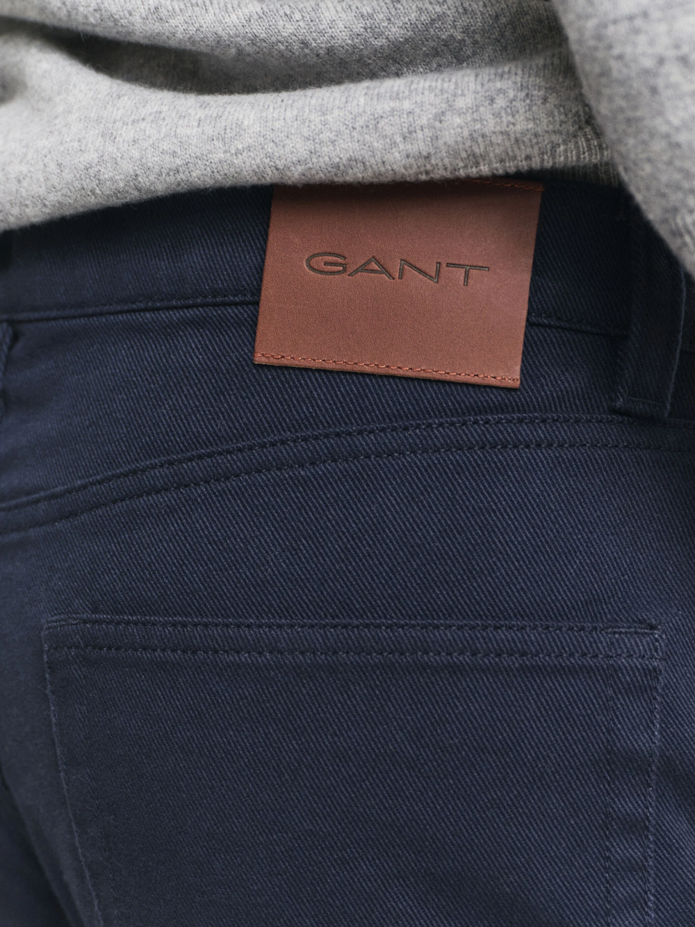 Following a classic and timeless style, this jean is cut with a mid-rise waist and a slim fit. Crafted from a soft brushed twill fabric with comfort stretch, these jeans have a 5-pocket design, branded shank buttons and rivets, a zip fly and a leather GANT logo patch at the back.