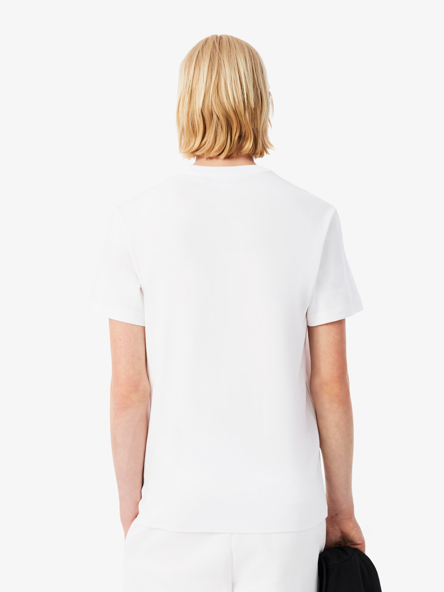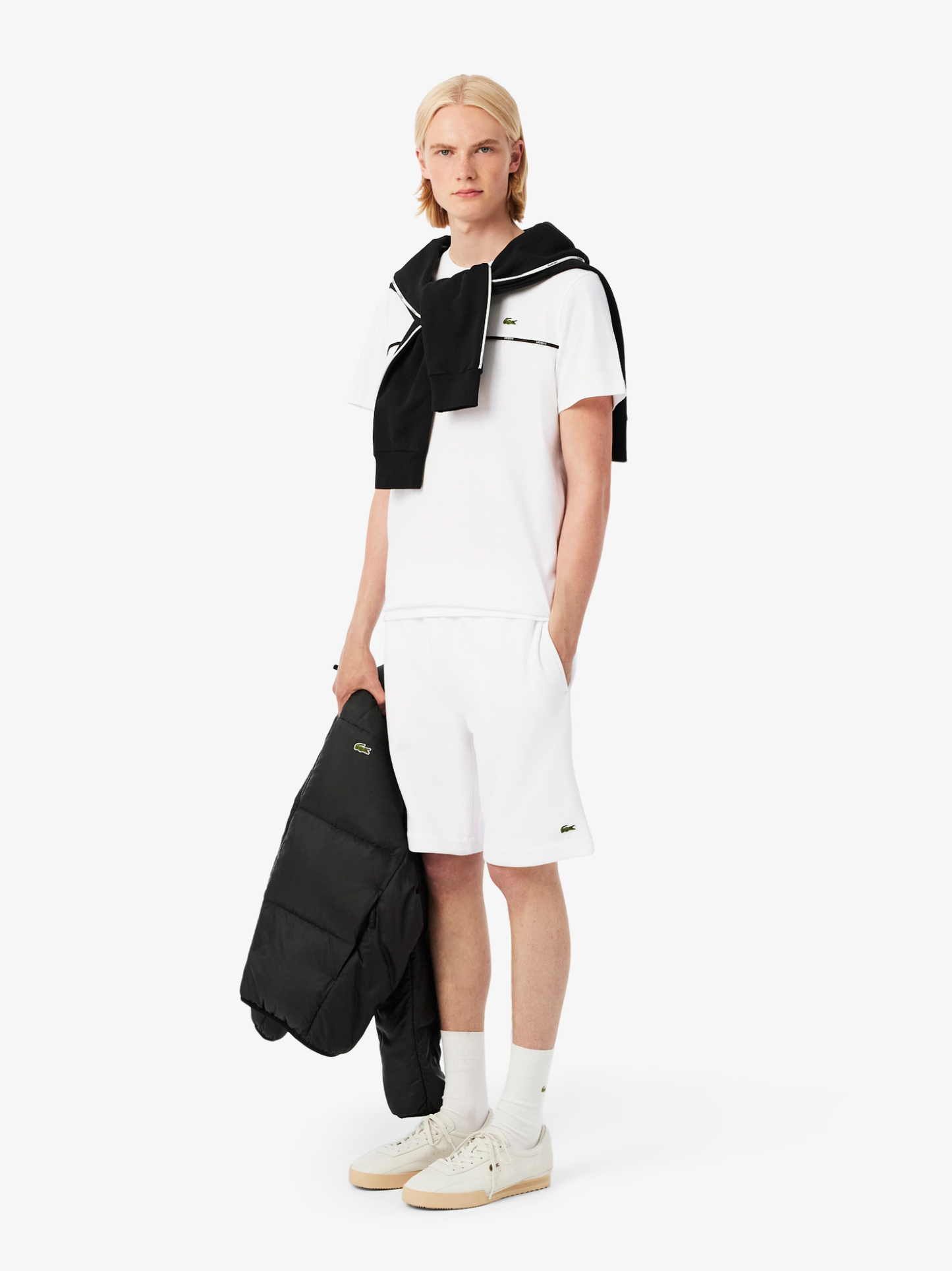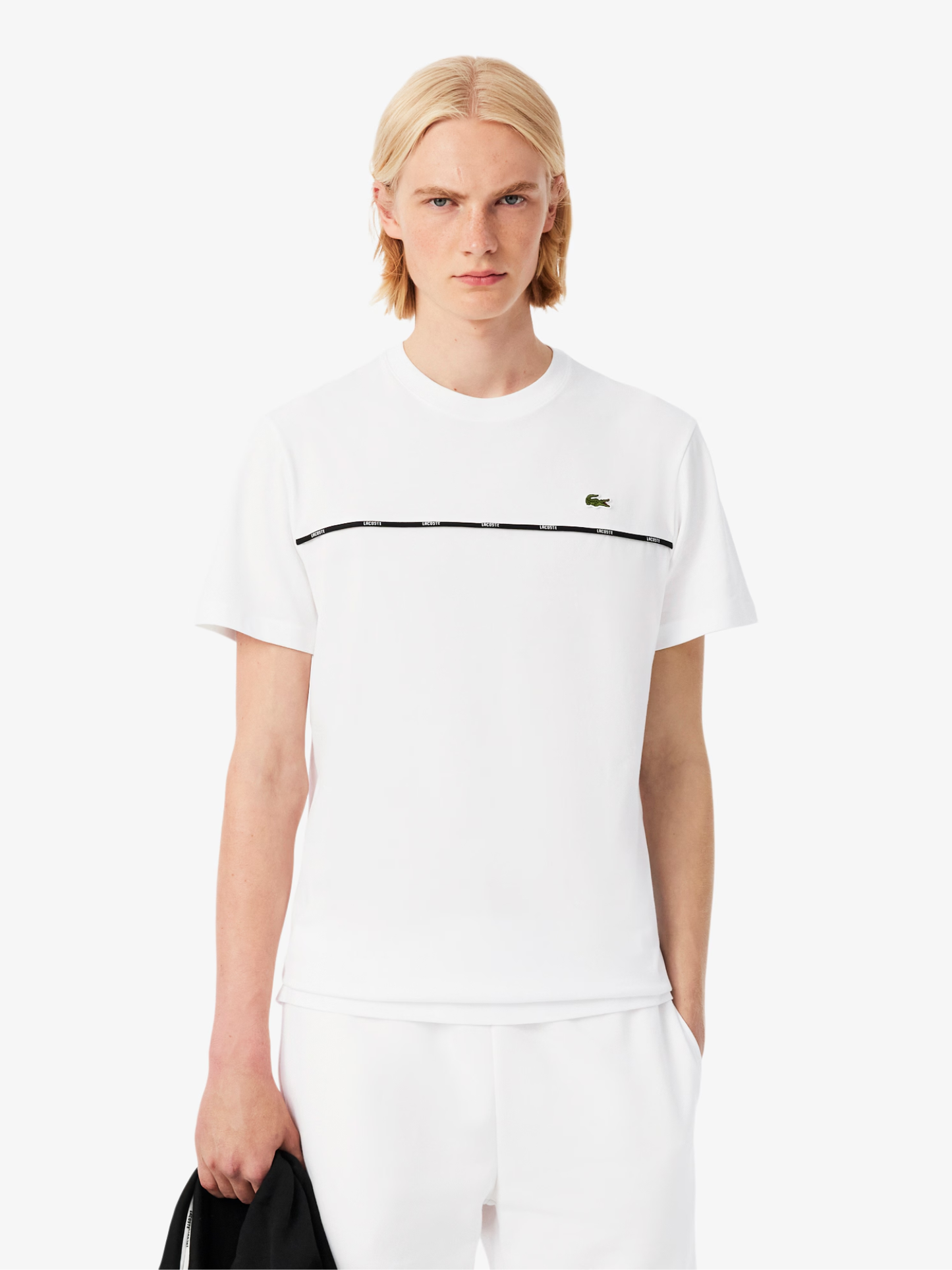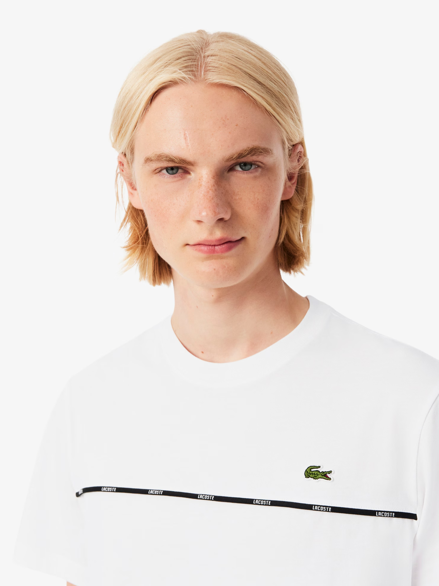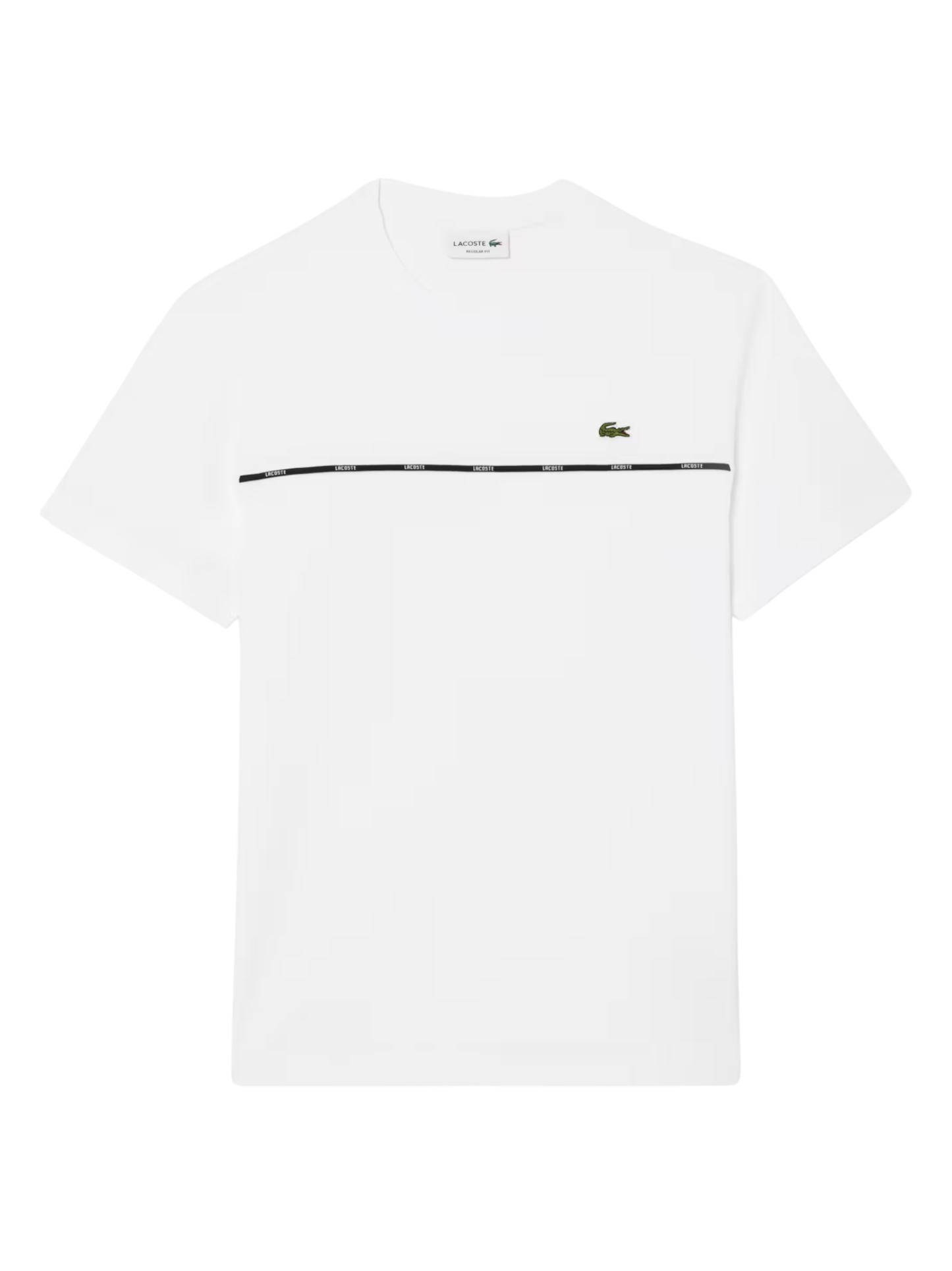 This T-shirt from Lacoste, sportswear creators since 1933, is a lesson in style. The comfortable cotton jersey design features a contrast Lacoste branded central trim accent, plus an embroidered crocodile on the chest. The ultimate in everyday casual chic.