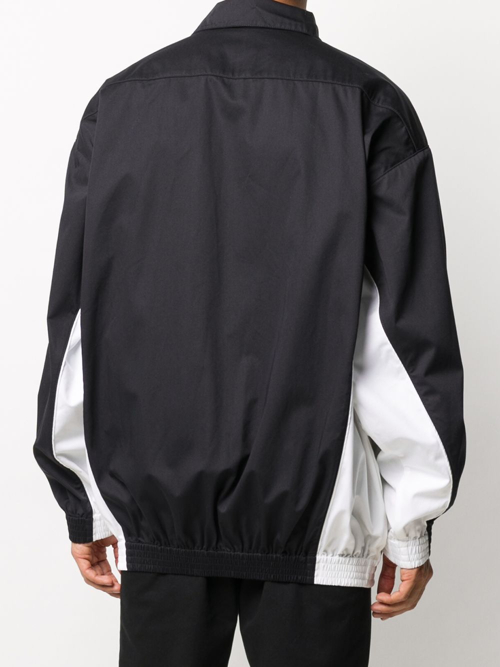 Regular price $561.00 USDCome rain or shine this colour block Balenciaga jacket will see you through the seasons. Fabricated in white and navy blue cotton it's a must-have wardrobe staple. We'd battle the elements to get our hands on one.
