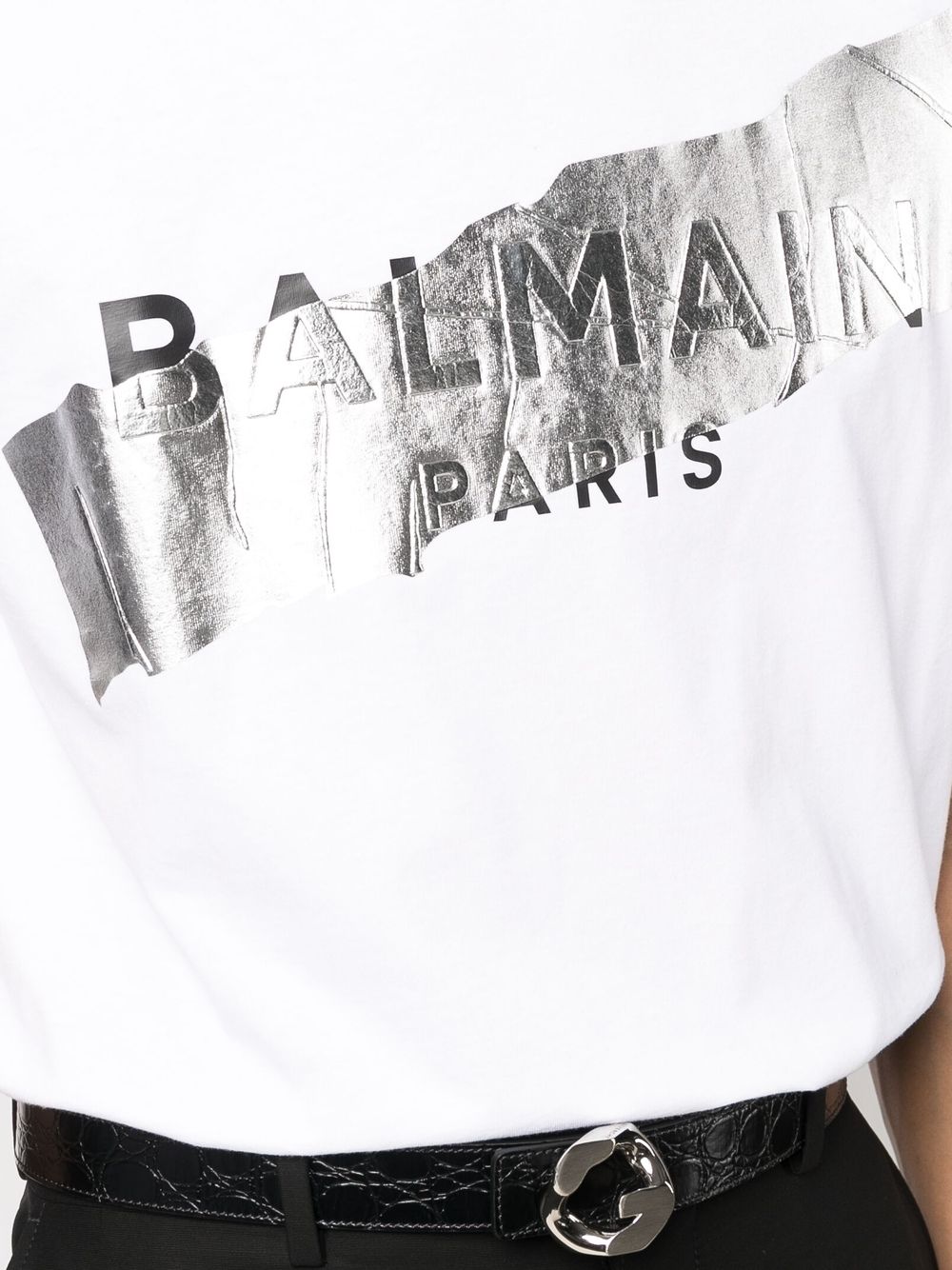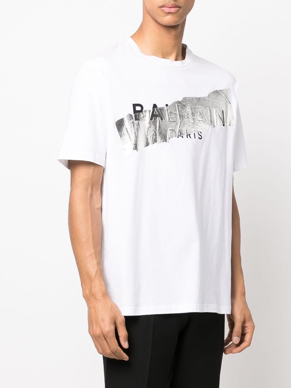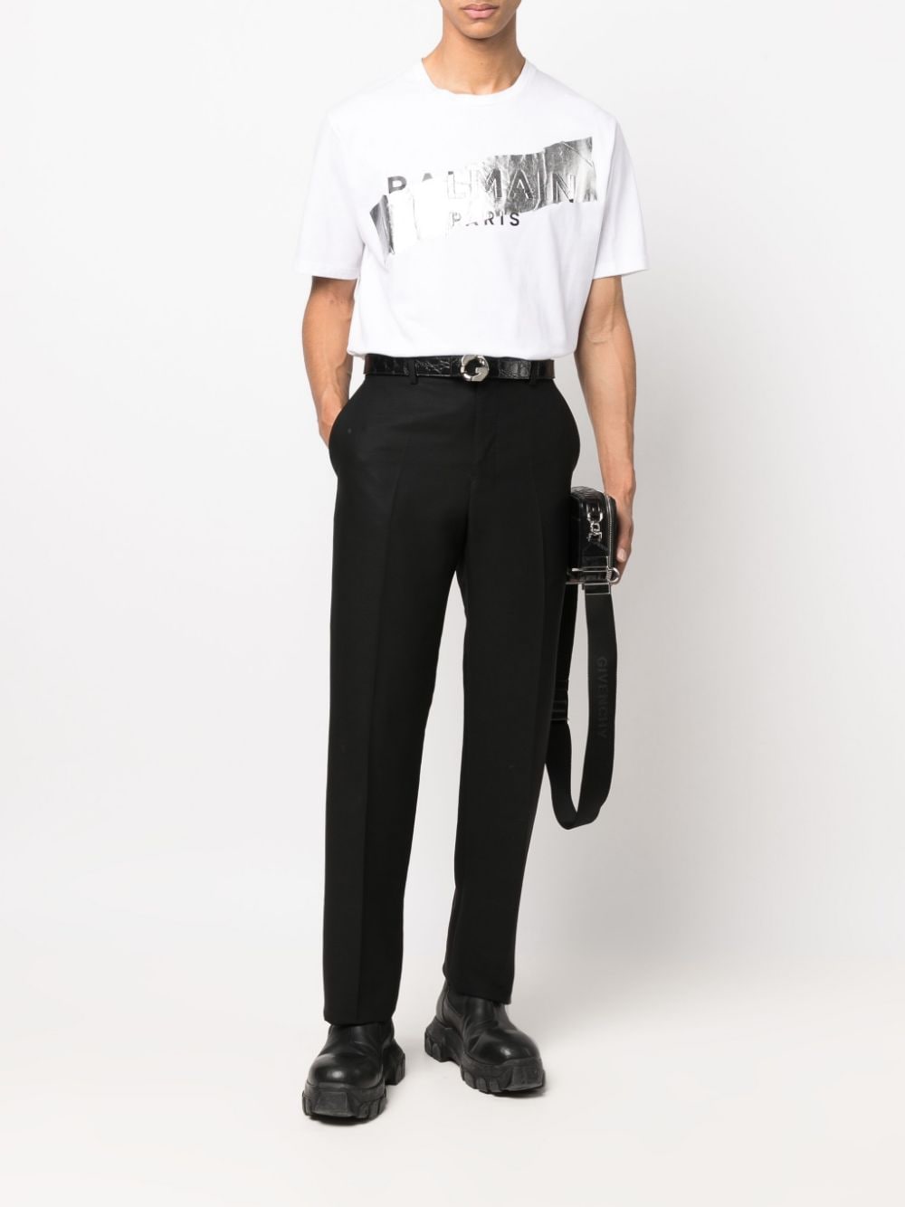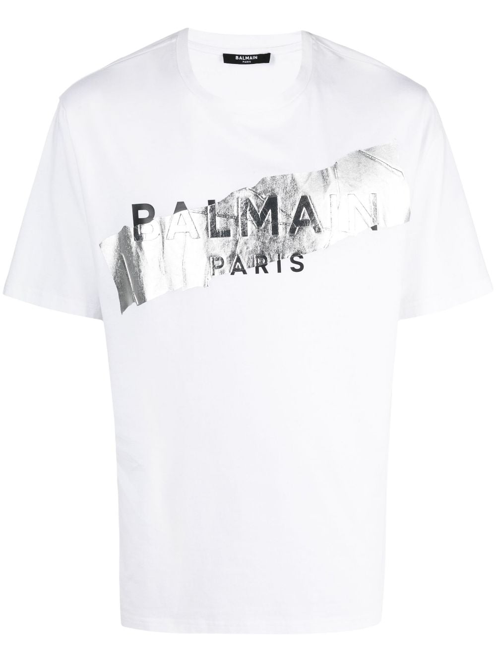 Design by Balmain, this T-shirt embodies a minimalist design with a bold twist: the brand's unmistakable logo is detailed with a silver-toned metallic tape for an irreverent look.