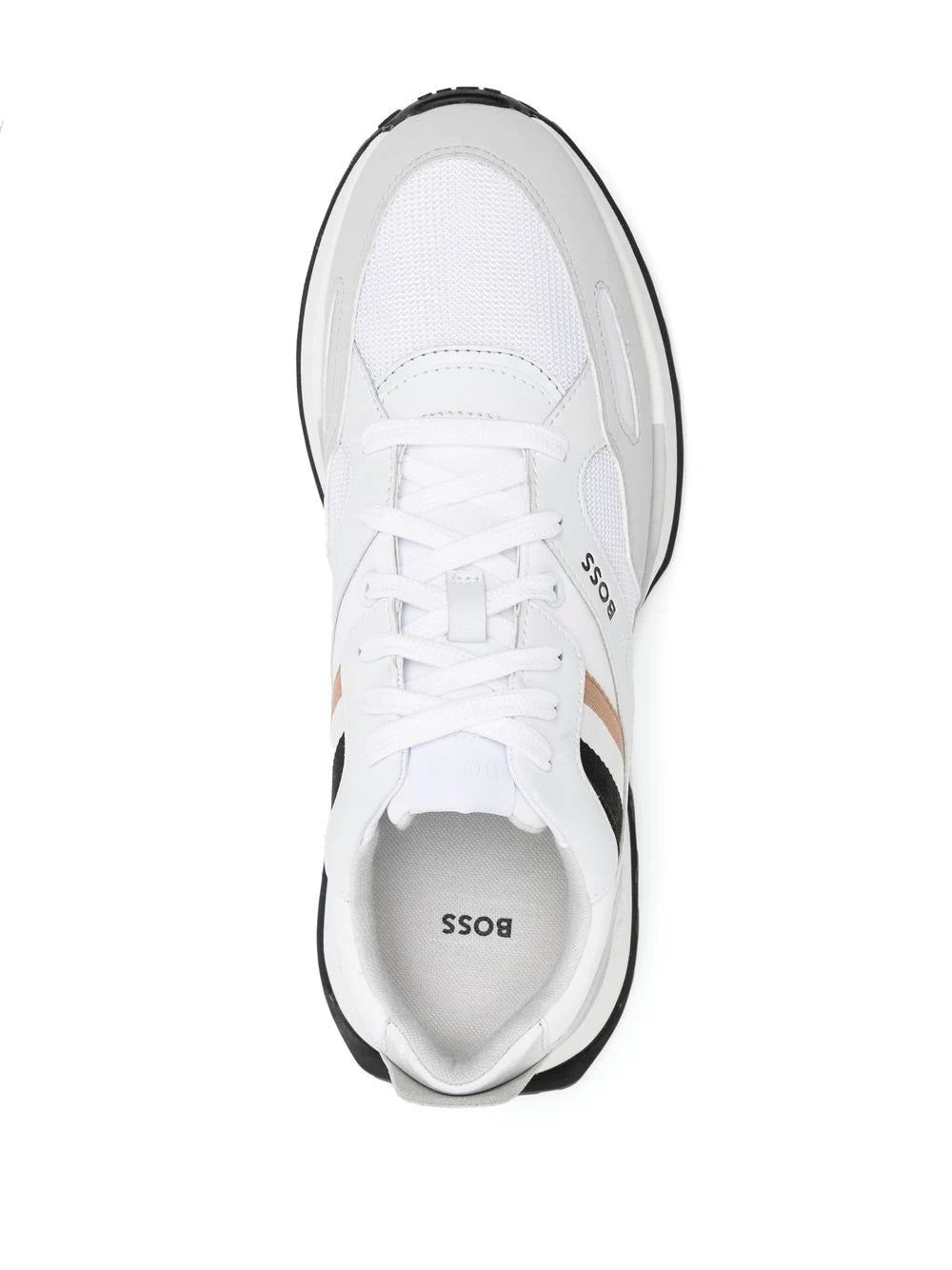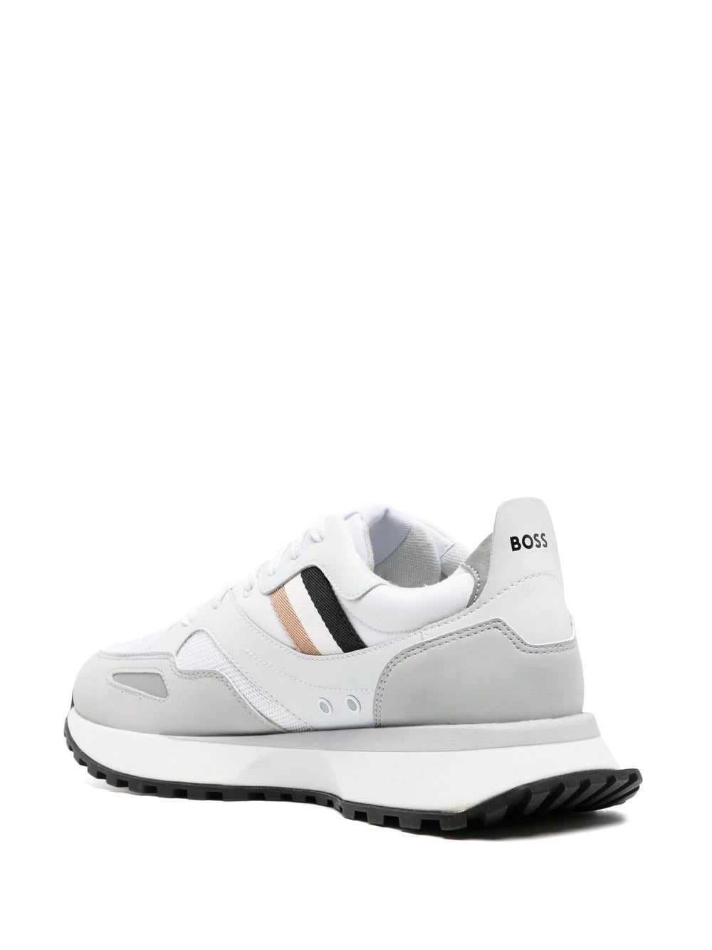 Jonah low-top panelled sneakers from BOSS featuring ivory white, black, beige, calf leather, branded heel counter, panelled design, almond toe, front lace-up fastening and flat rubber sole.