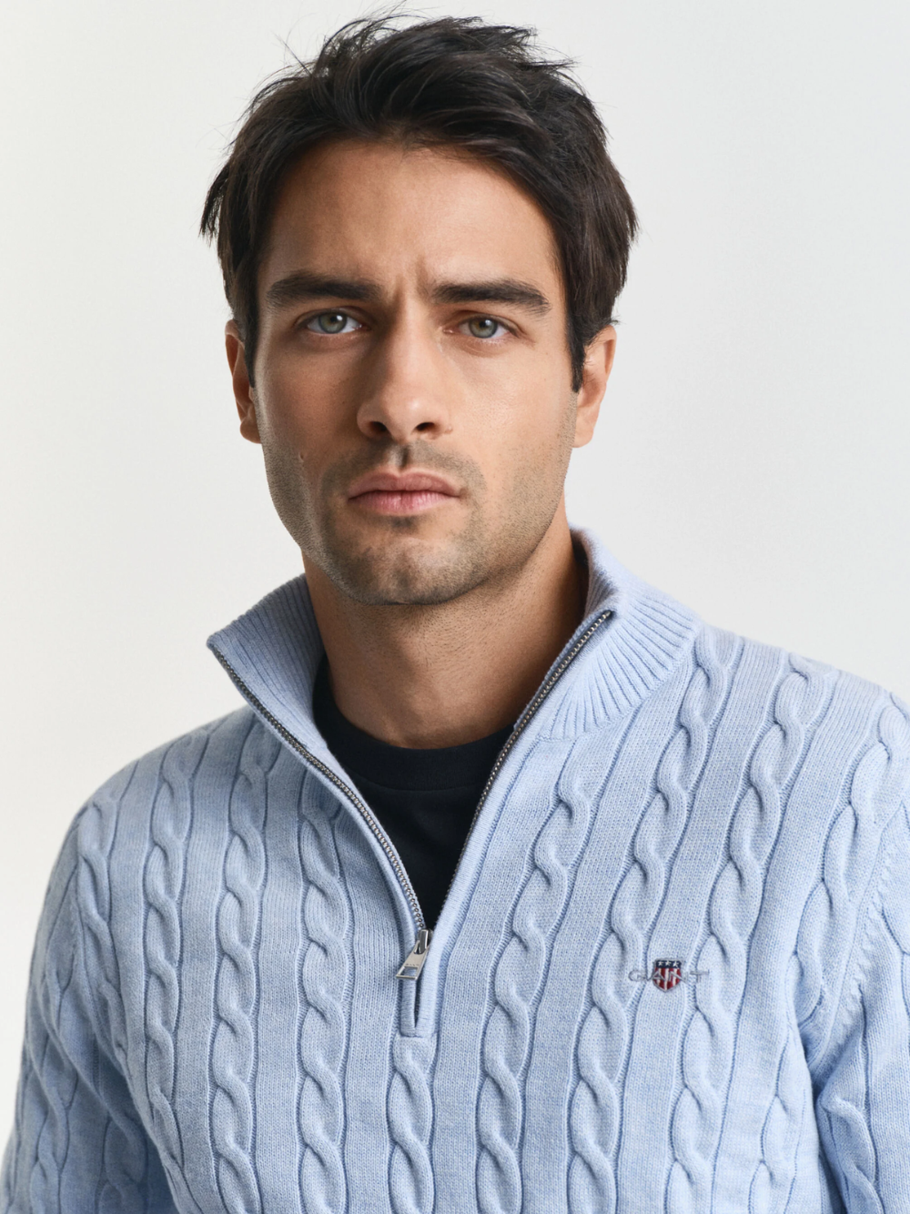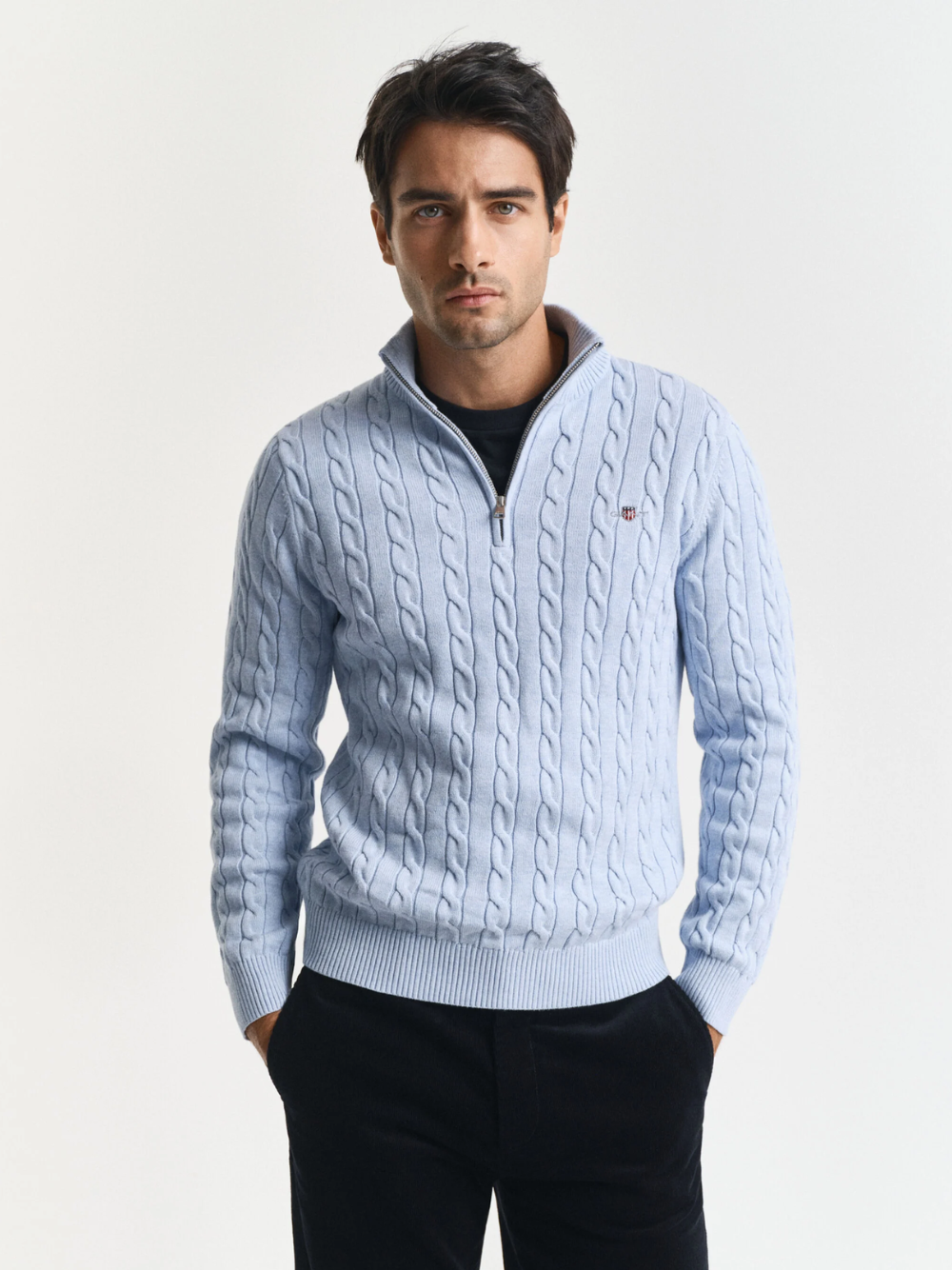 Regular price $149.00 USDDesigned in cotton with an all-over cable knit structure, this soft sweater has a regular fit and a half-zip collar. A preppy essential, it is detailed with our iconic GANT Archive shield graphic embroidered at the chest and features ribbed endings at the neck, hem and cuffs.