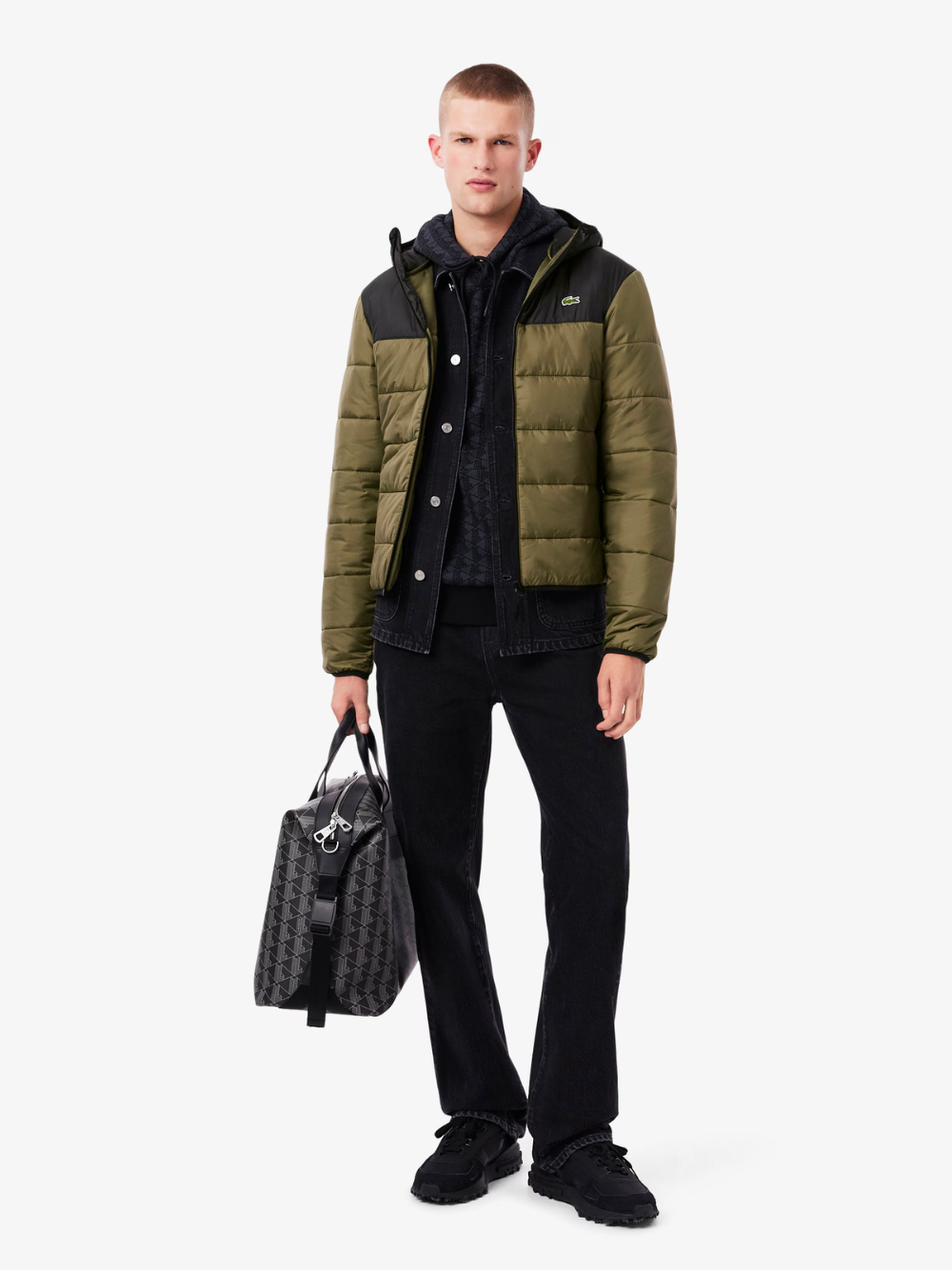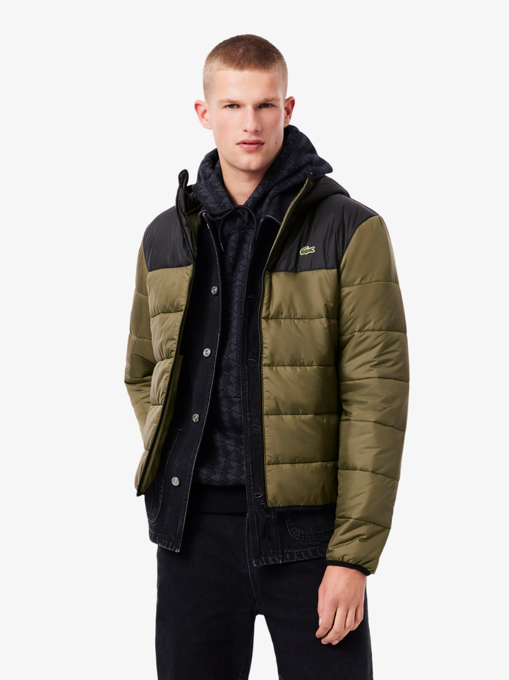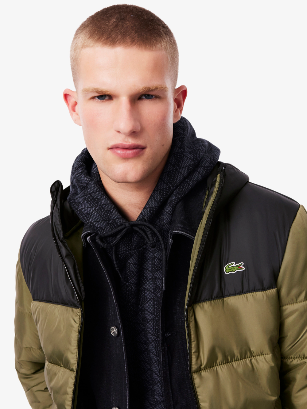 This padded, waterproof taffeta jacket is a lesson in Lacoste technical expertise. Warm and elegant, with a protective quilted hood and plenty of pockets for your essentials. Designed for the modern man, with colour-block details and an iconic crocodile