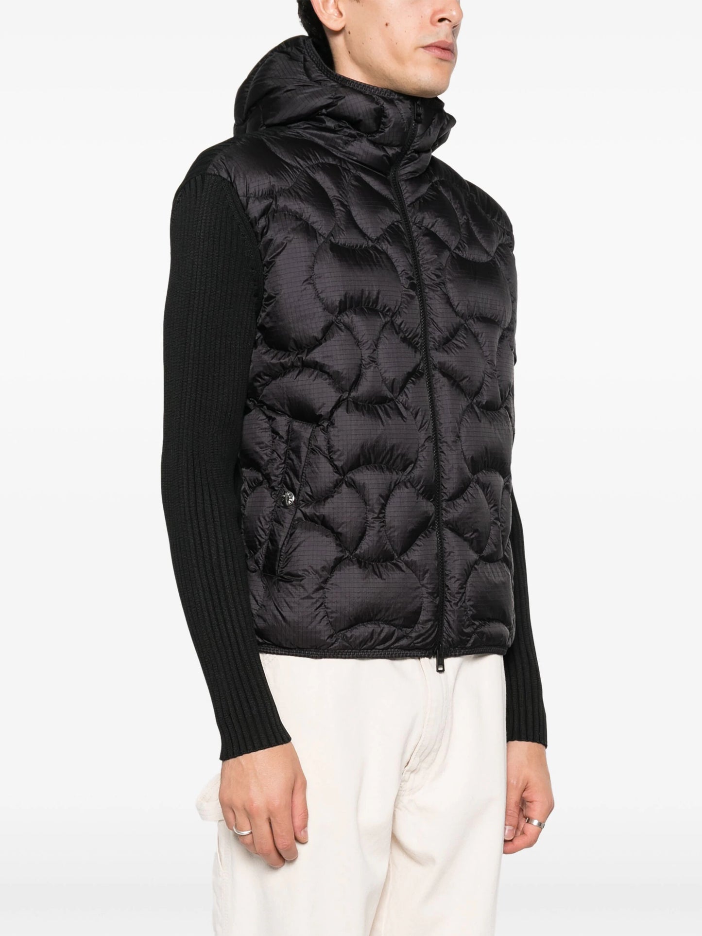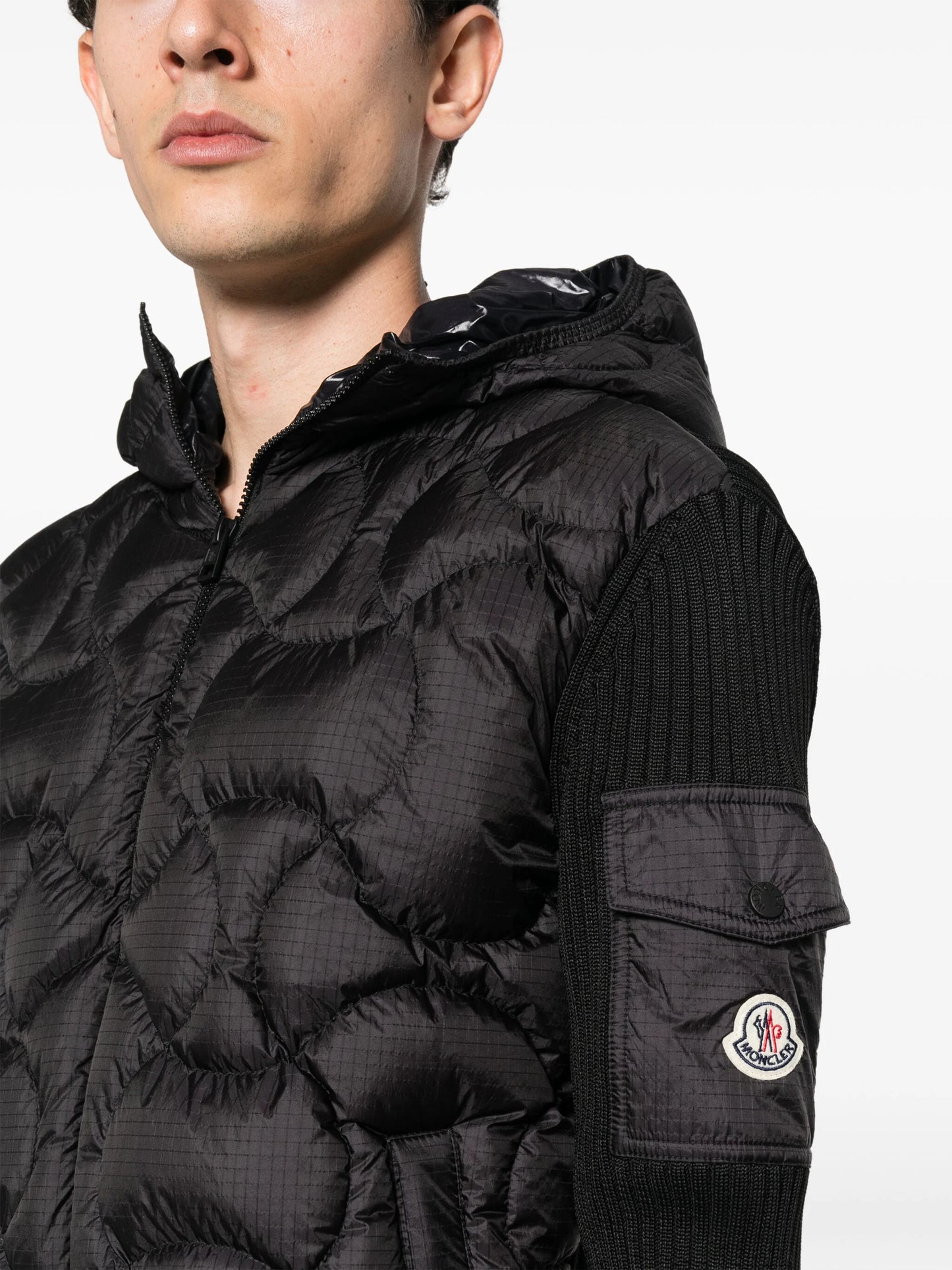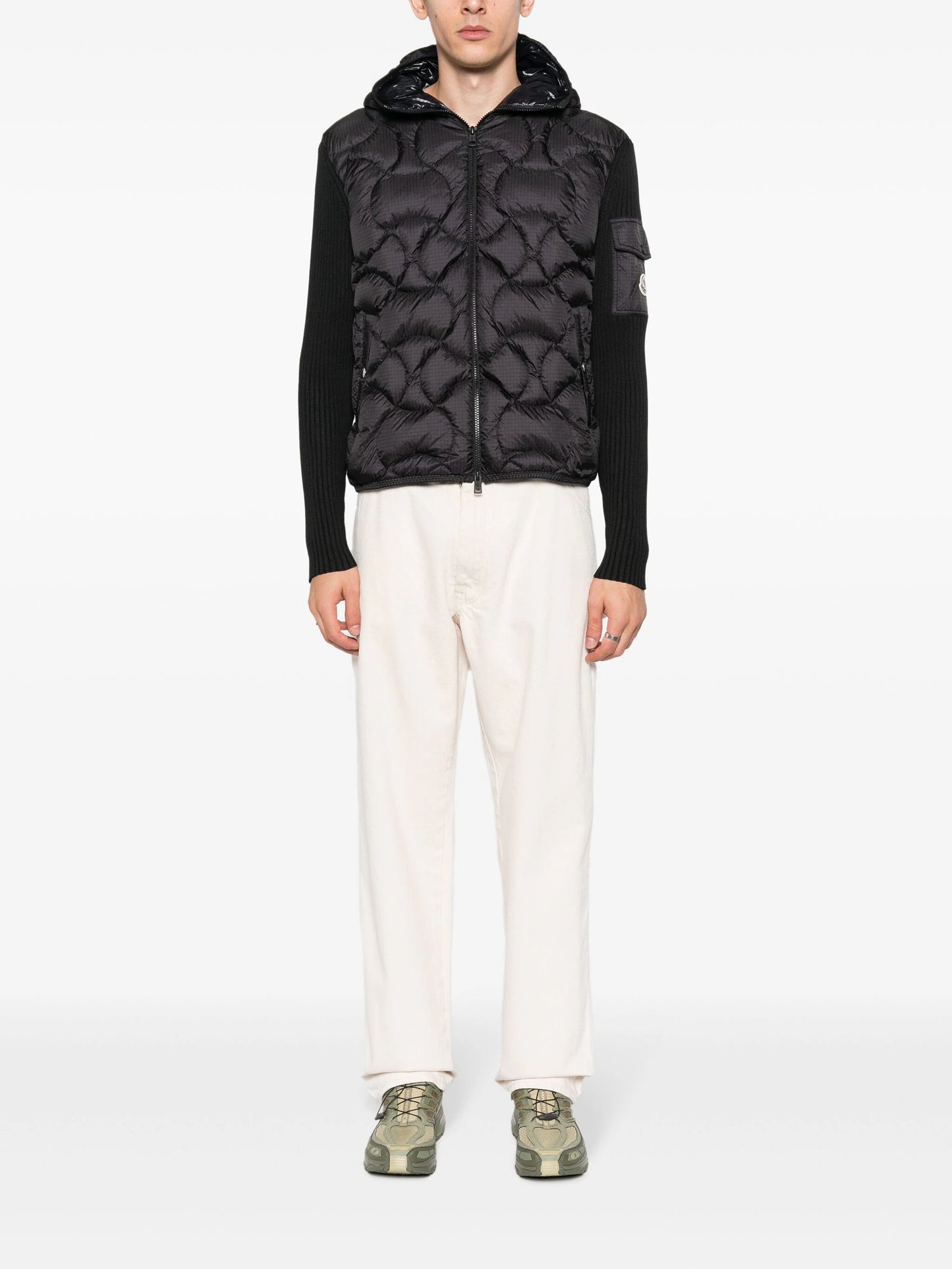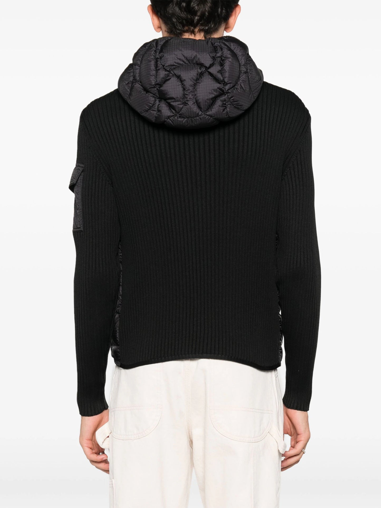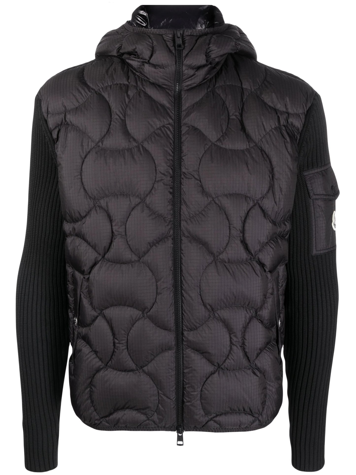 Moncler merges beloved knitwear elements with cold-weather expertise in this black jacket. It’s rib-knitted with a down-filled quilted front panel for enhanced warmth and insulation and fitted with a hood for added protection.