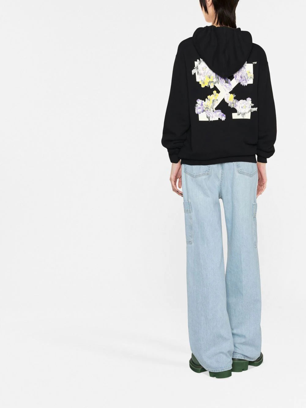 Cut for a relaxed fit, this black cotton hoodie from Off-White is decorated with a colourful floral print and boasts the brand's signature Arrows motif to the rear.
