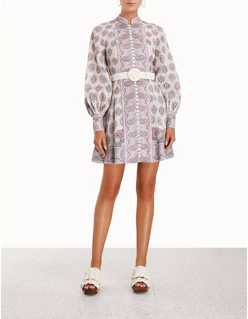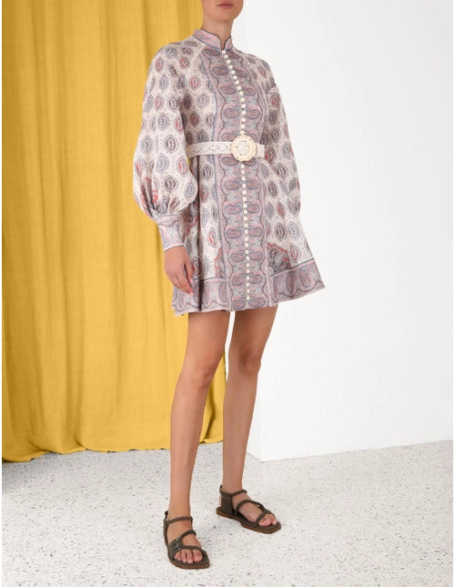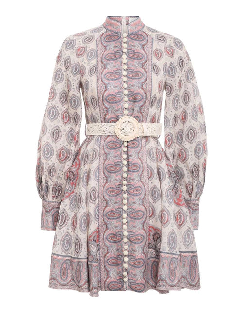 the vitali button up mini dress in ivory paisley from our resort swim 2023 collection. a linen mini dress featuring a mandarin collar, blouson sleeves and buttons down the centre front, finished with a belt and a line skirt.