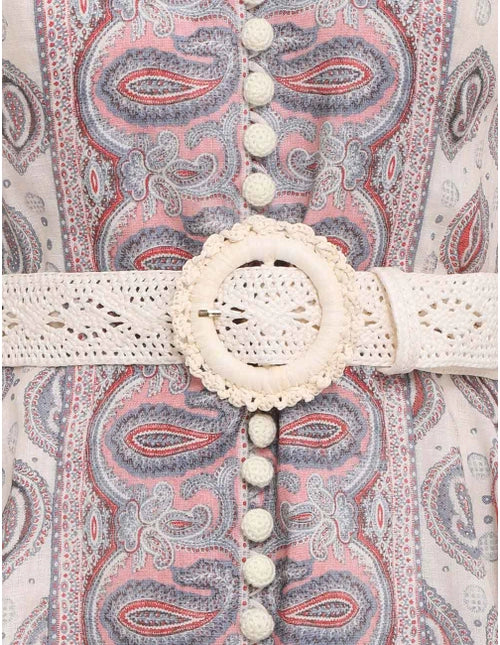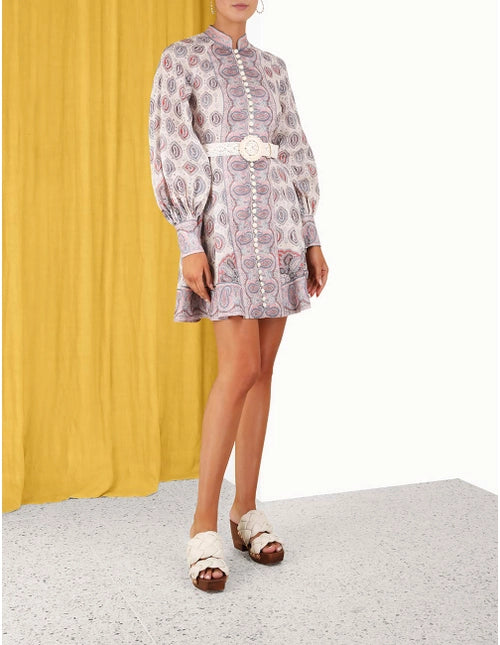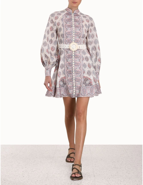 Regular price $541.00 USDthe vitali button up mini dress in ivory paisley from our resort swim 2023 collection. a linen mini dress featuring a mandarin collar, blouson sleeves and buttons down the centre front, finished with a belt and a line skirt.