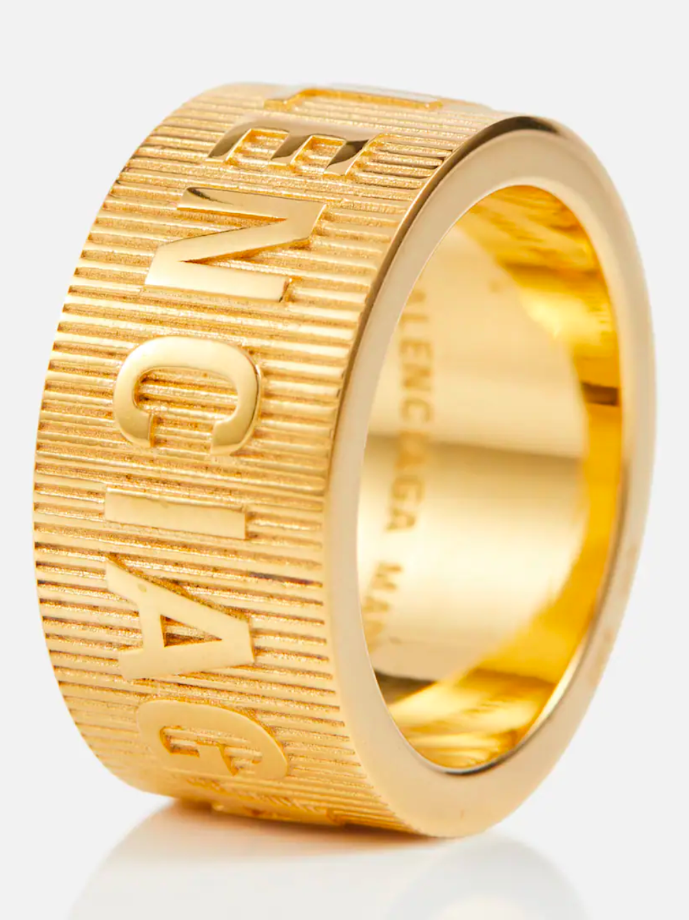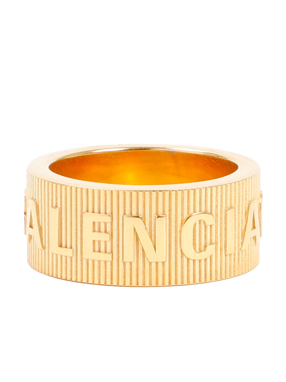 Balenciaga's ring is made from gold-coloured sterling silver with a grooved surface and logo engraving.