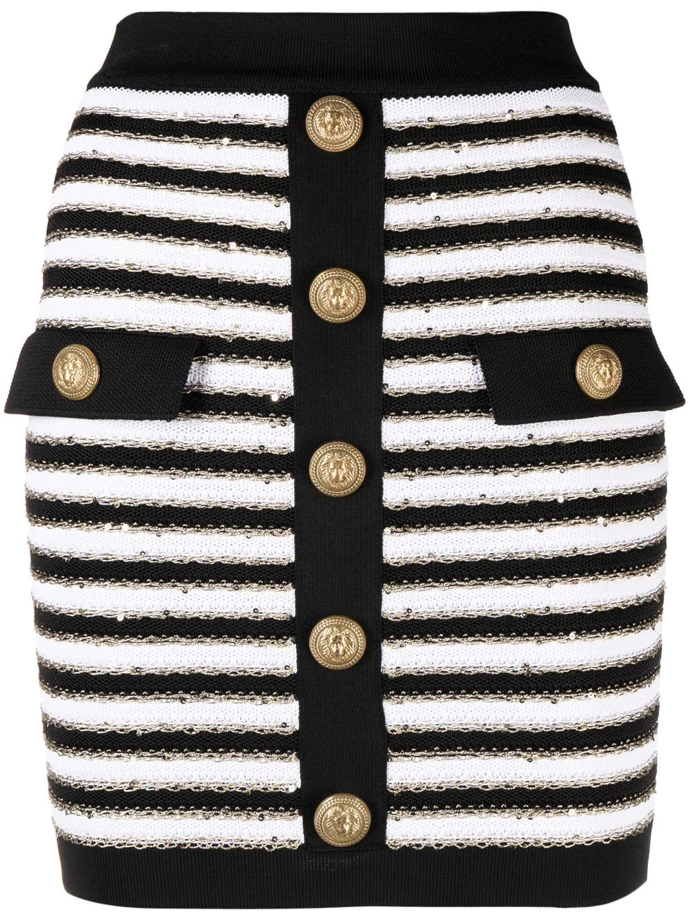 Eye-catching embossed buttons are a mainstay at Balmain, speaking to the house's opulent aesthetic. They appear in a gold-tone finish here, contrasting with the skirt's two-tone striped pattern for an elevated casual look.