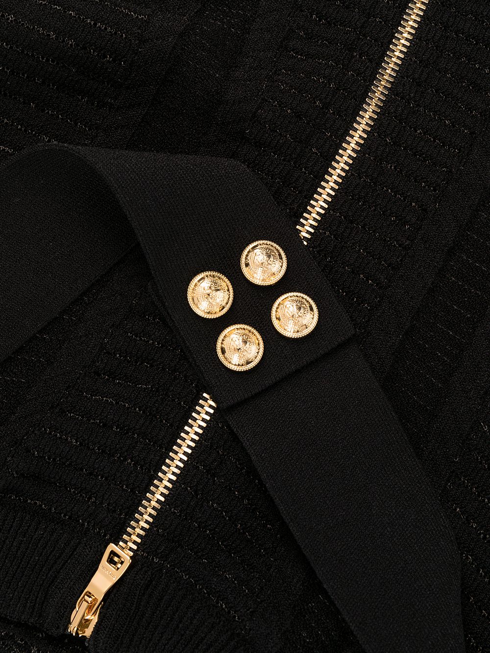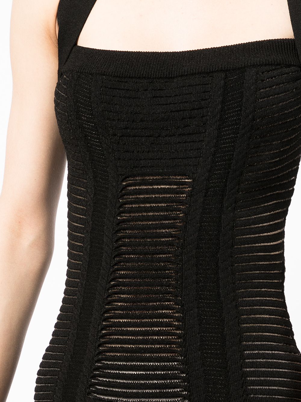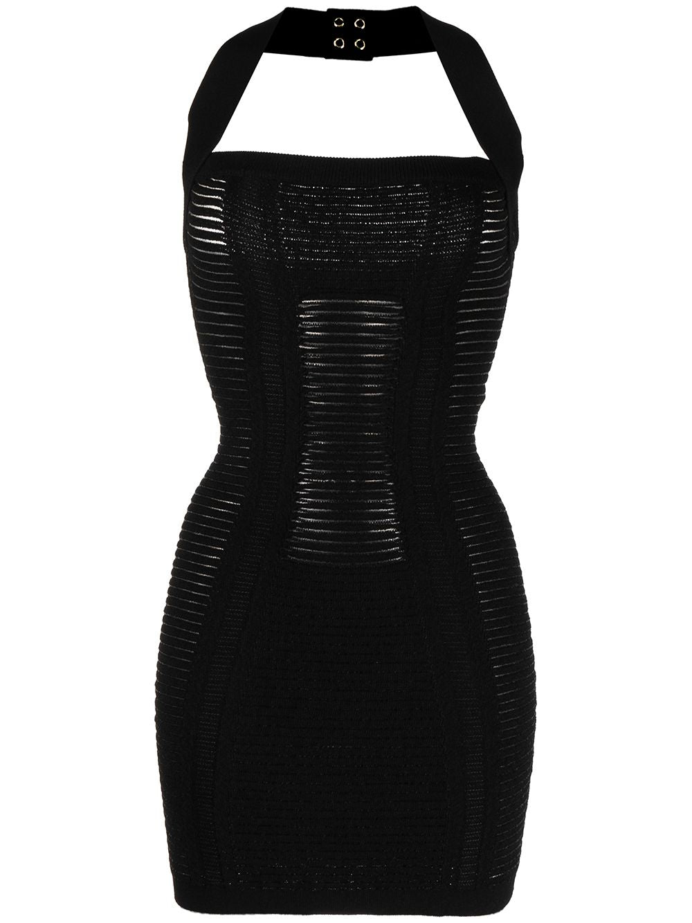 Illustrative of Balmain’s confident aesthetic, this dress showcases a fitted halterneck design that reveals an open back. Presented in classic black, the silhouette is crafted with ribbed panelling for added range of motion.
