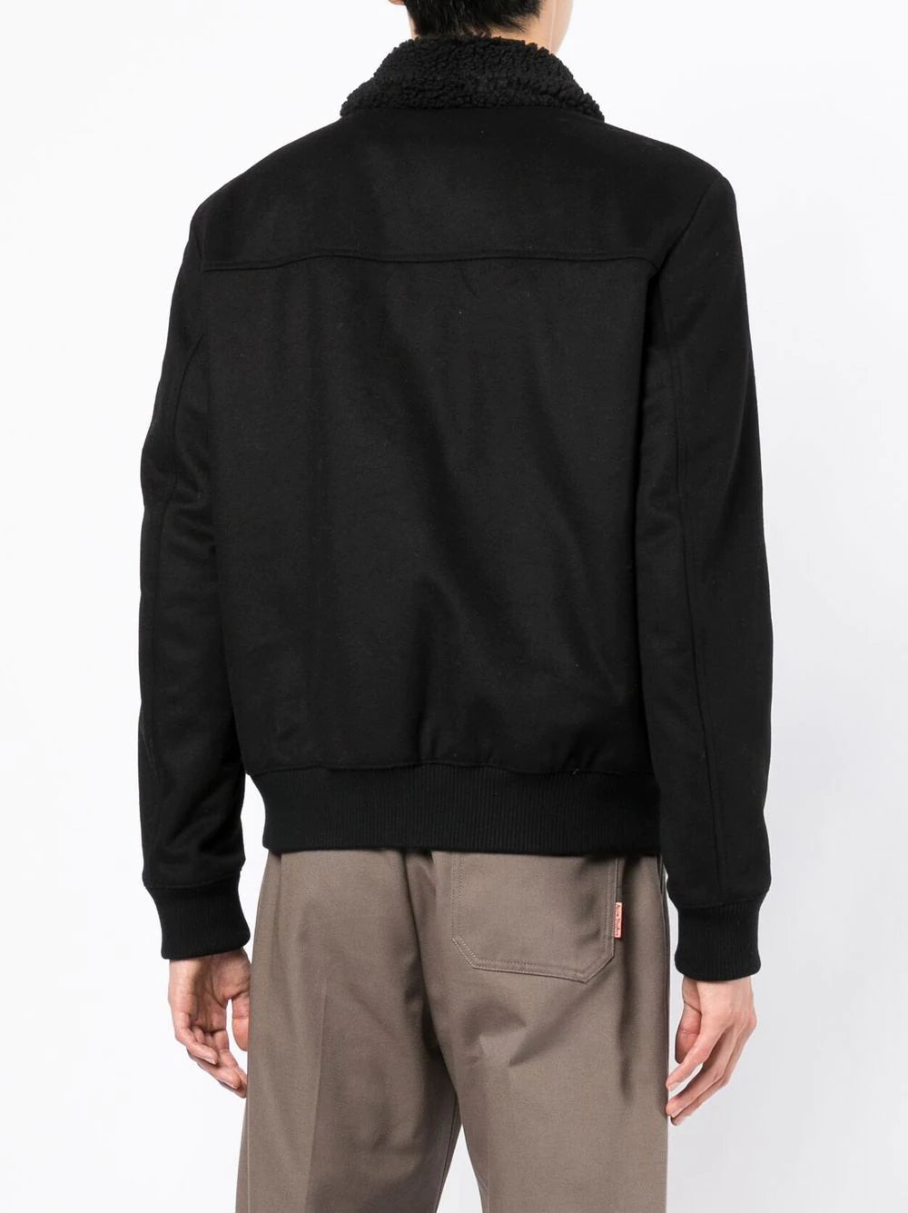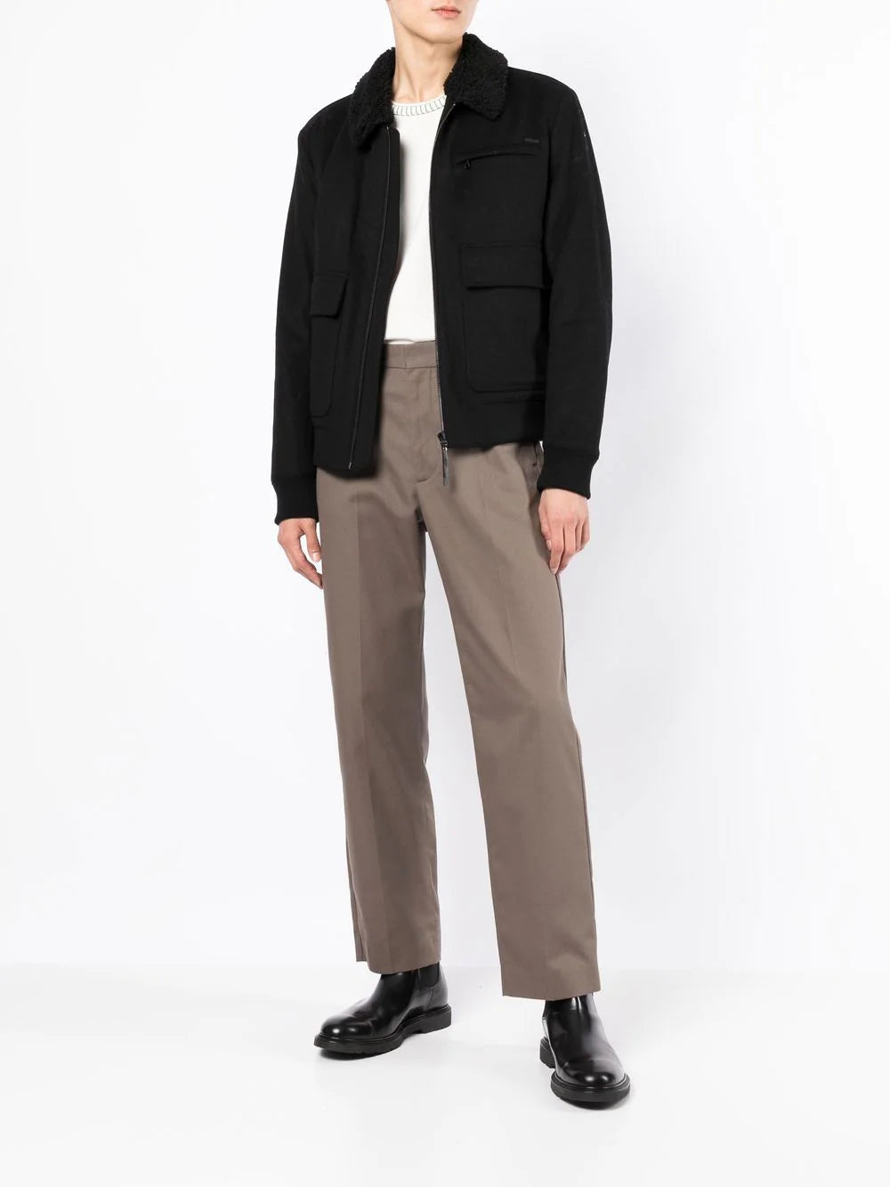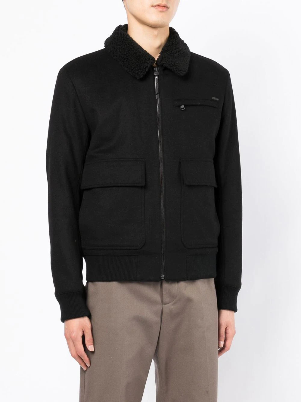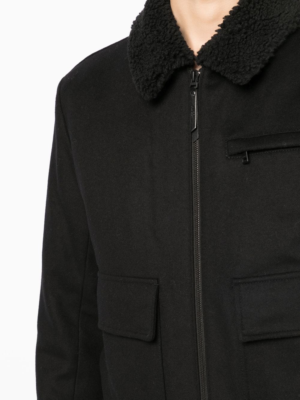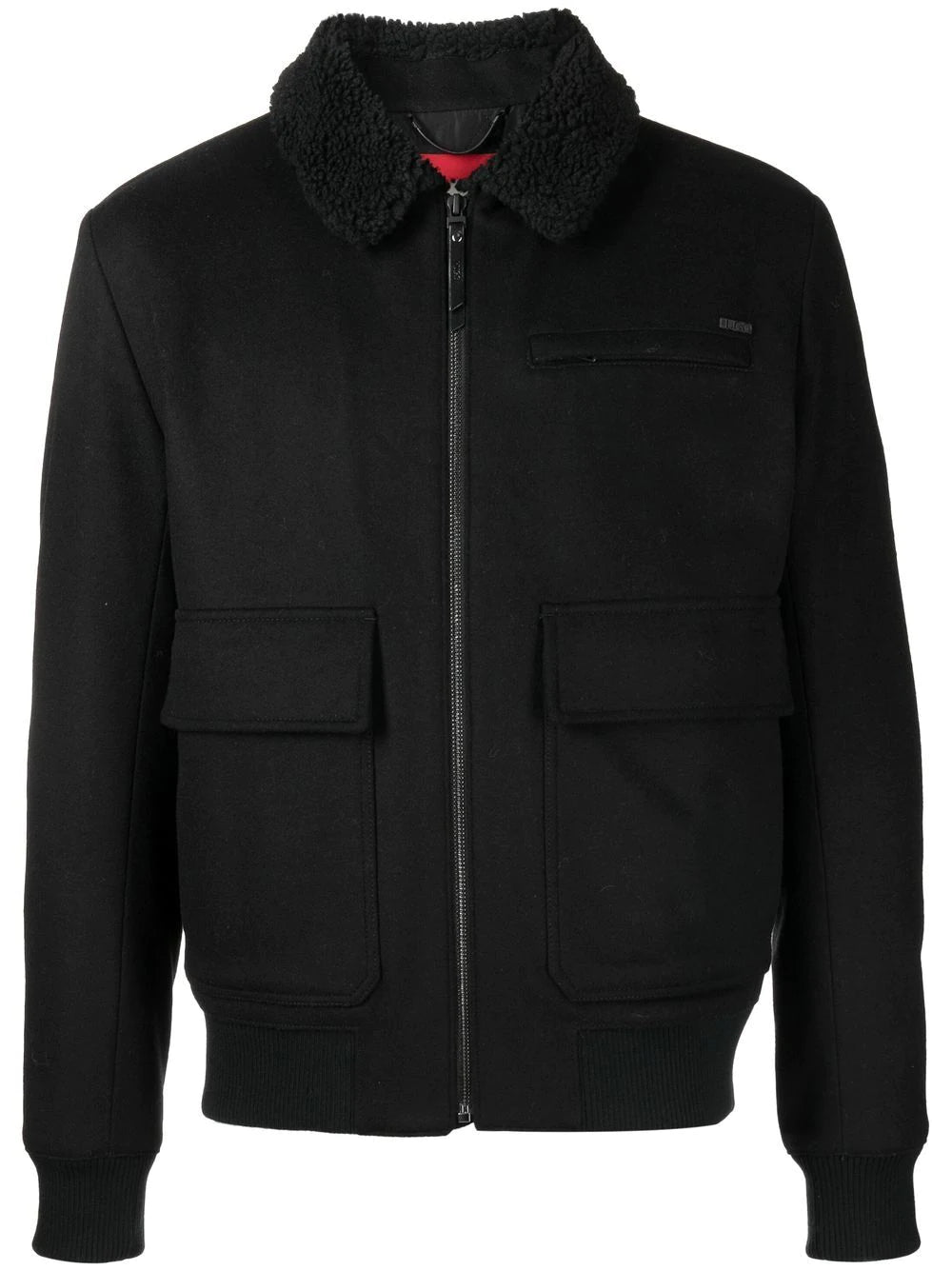 shearling-collar virgin-wool jacket from HUGO featuring black, virgin wool-cashmere blend, shearling collar, logo print at the chest, front zip fastening, zip-fastening chest pocket, two front patch pockets, long sleeves and straight hem.