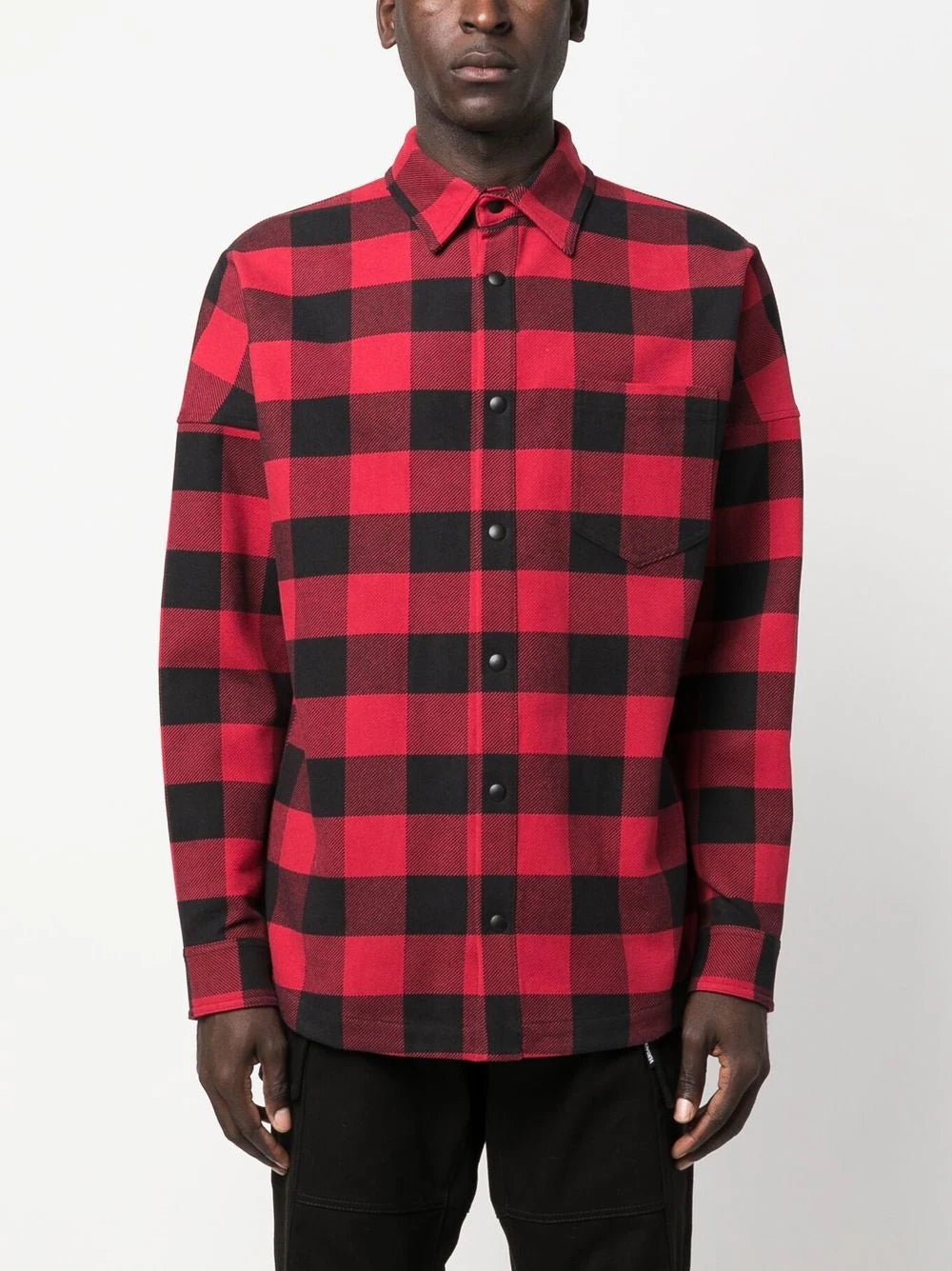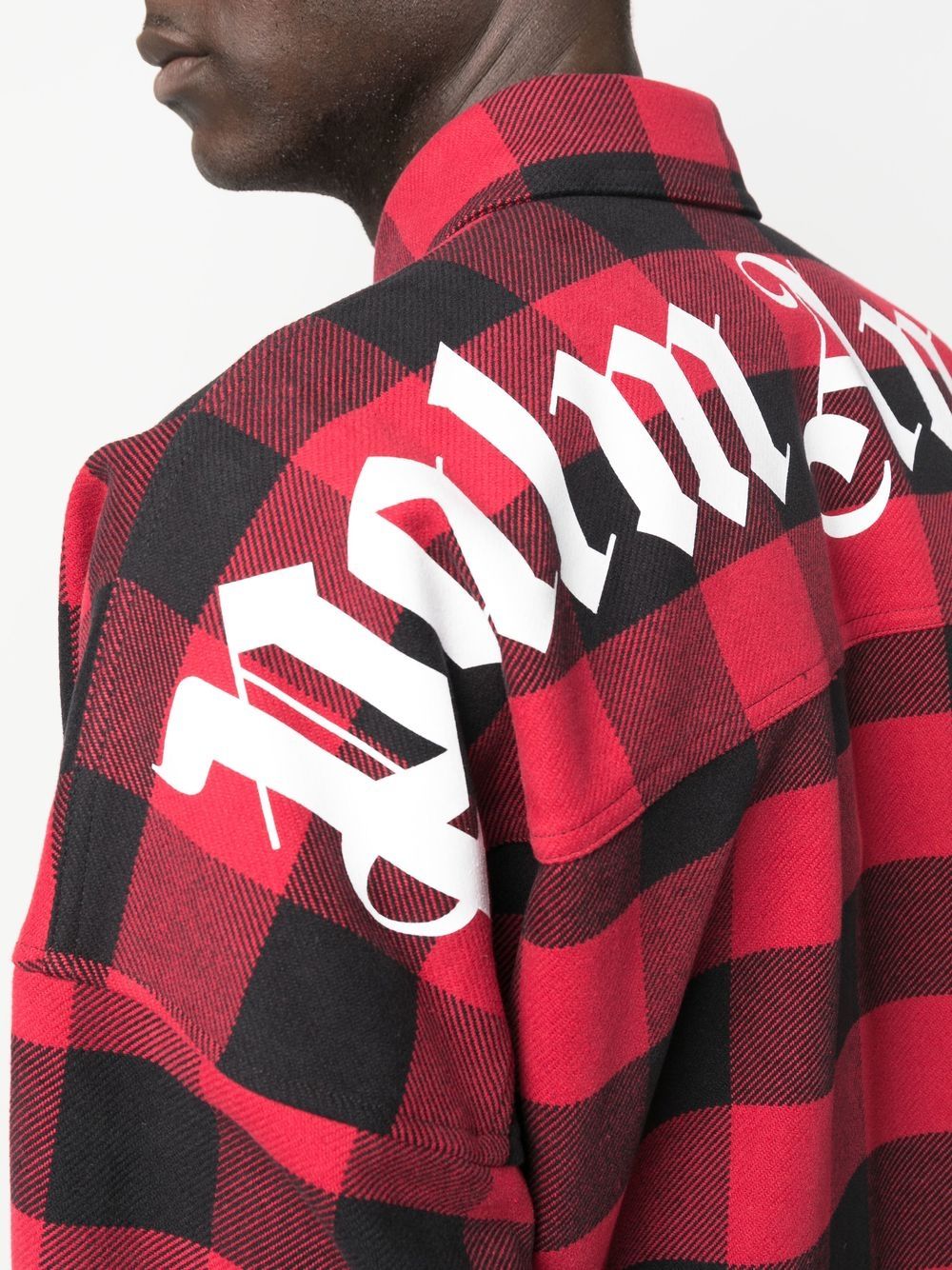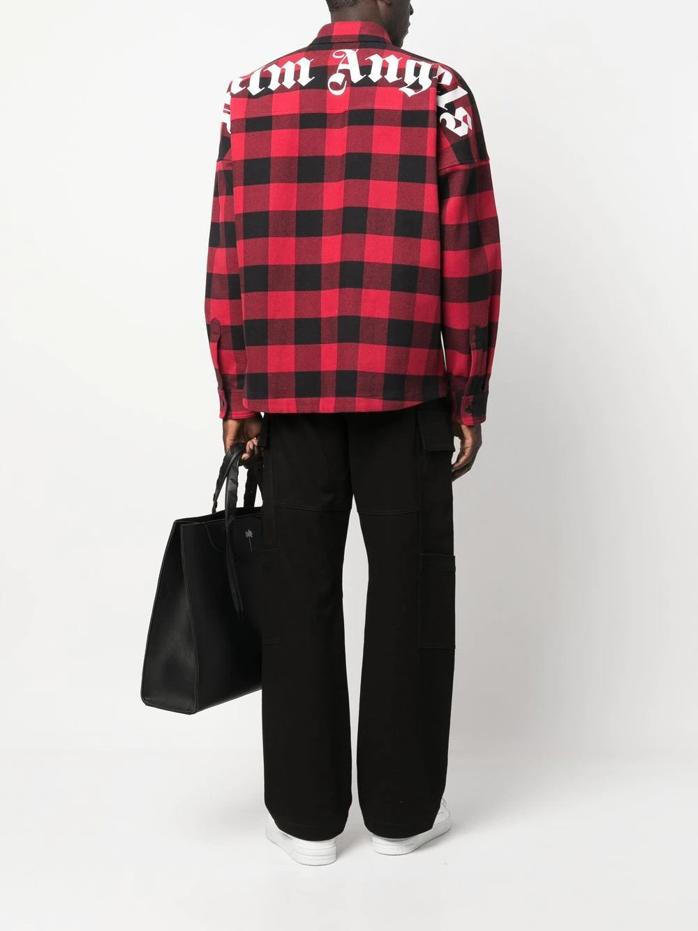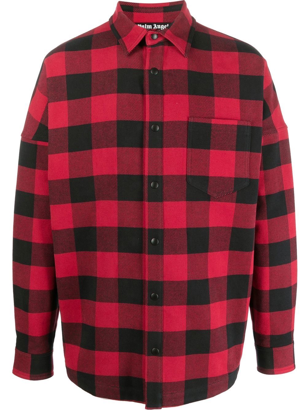 logo-print plaid-check shirt from PALM ANGELS featuring black/red, cotton, plaid check pattern, classic collar, chest patch pocket, front button fastening, logo print to the rear, curved hem and long sleeves.