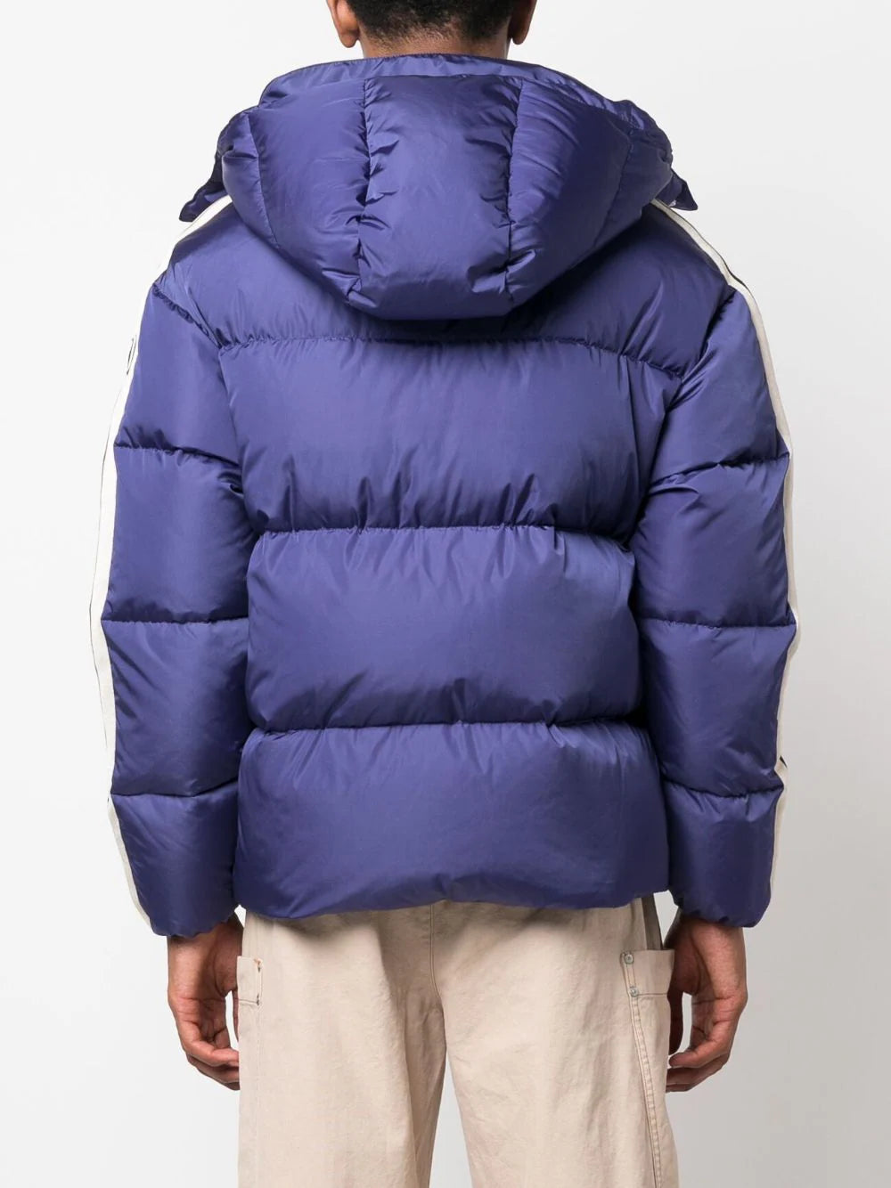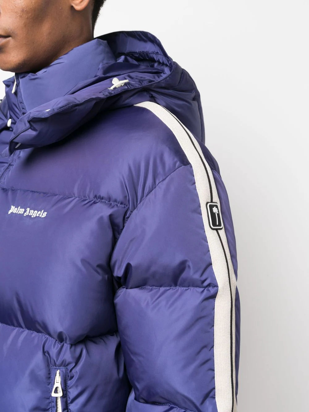 Fusing sportswear with wintry outerwear, Palm Angels presents this navy-blue puffer jacket. Made in Italy, it is insulated with a down-feather filling and quilted for optimal heat retention, with the detachable hood compounding the protective quality. Contrasting white stripes at the sleeves add decoration in the style of track designs, whilst the logo print at the chest lends a branded note.